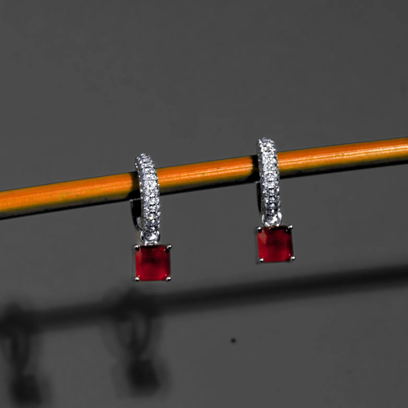 Design – Minimal yet bold; square red stones with sparkling zircon accents on hoops