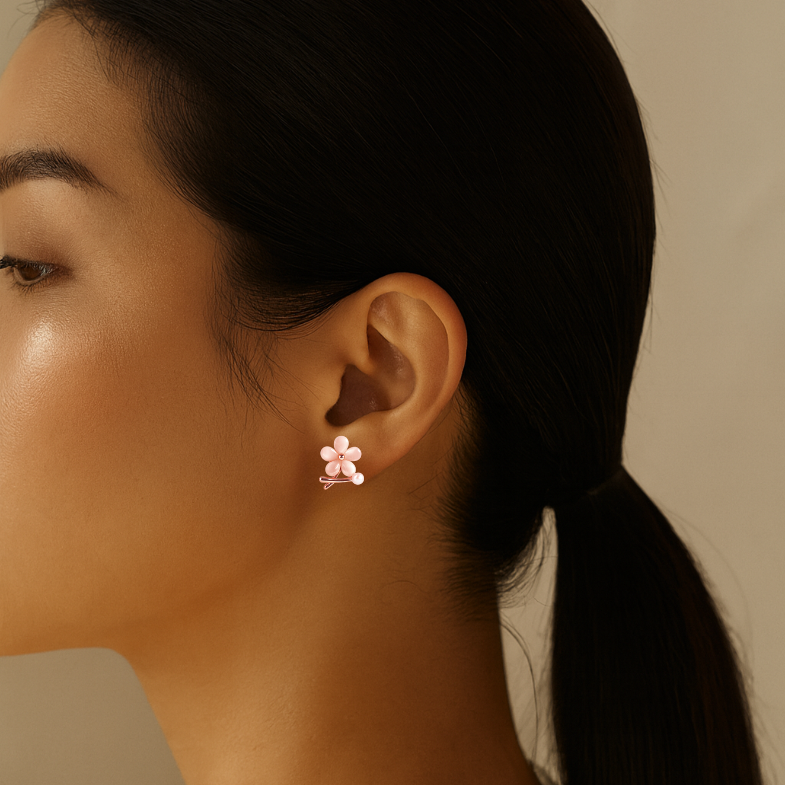 Crafted in 92.5 sterling silver with a lustrous rose gold plating, these charming stud earrings feature a graceful five-petal flower design paired with a luminous pearl at the base. The soft blush tones of the petals create a feminine, modern vibe, while the pearl detail adds a timeless touch of elegance. Lightweight and versatile, these earrings seamlessly transition from daily wear to special occasions, making them a perfect blend of contemporary style and classic grace.