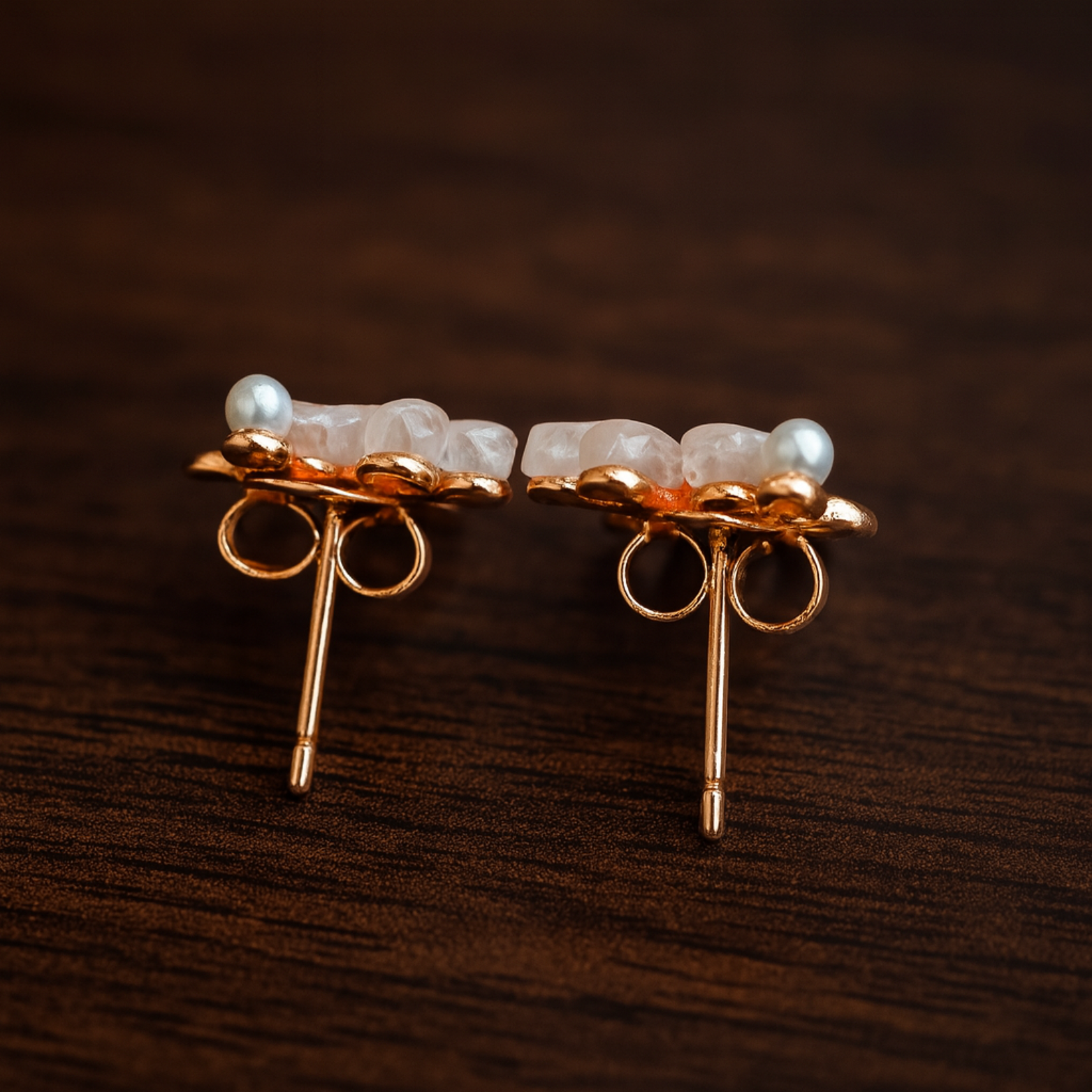 Delicate floral stud earrings in rose gold with a soft blush finish and elegant pearl accent