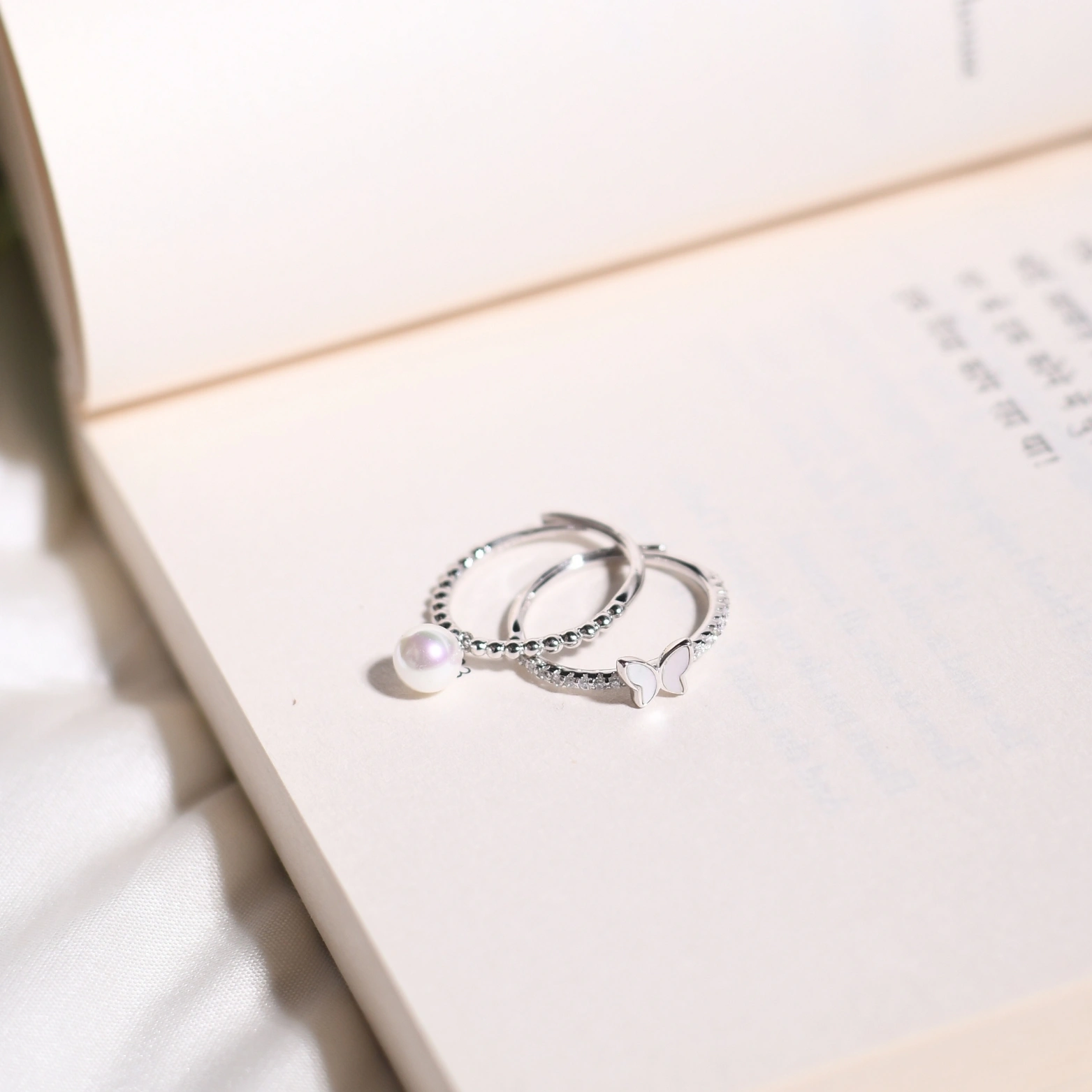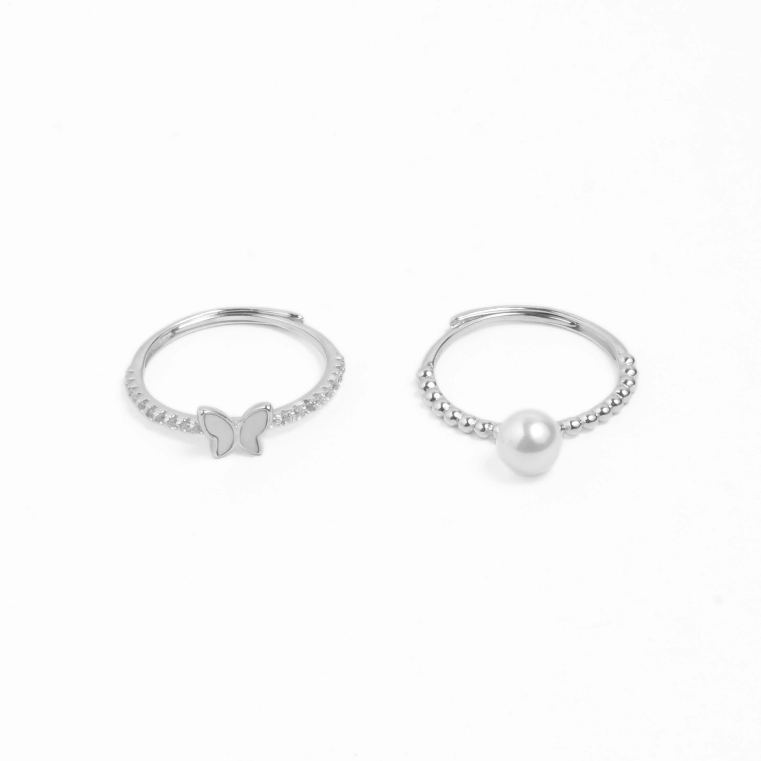This enchanting ring duo crafted in 92.5 sterling silver features one band adorned with a dainty pearl drop and another with a delicate butterfly charm and zircon-studded accents. Together, they create a soft, feminine statement—perfect for stacking or wearing solo. Designed for those who love a blend of elegance and playfulness.