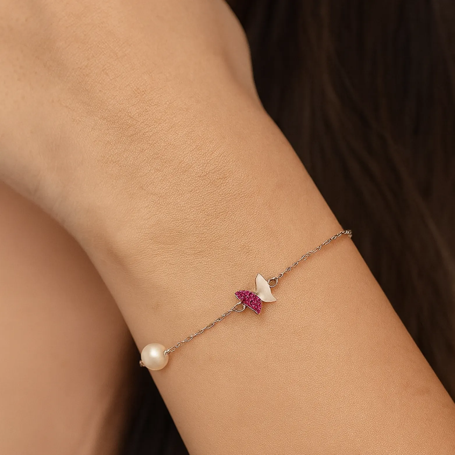 Crafted in 92.5 sterling silver, this elegant charm bracelet celebrates femininity and grace with its unique design. Featuring a dainty butterfly motif accented with pink stones, a luminous pearl, and a sparkling CZ, this bracelet captures the beauty of nature with a modern twist. Lightweight and stylish, it is perfect for layering with other bracelets or wearing solo for a subtle yet chic statement. A versatile piece designed for both everyday wear and special occasions.
