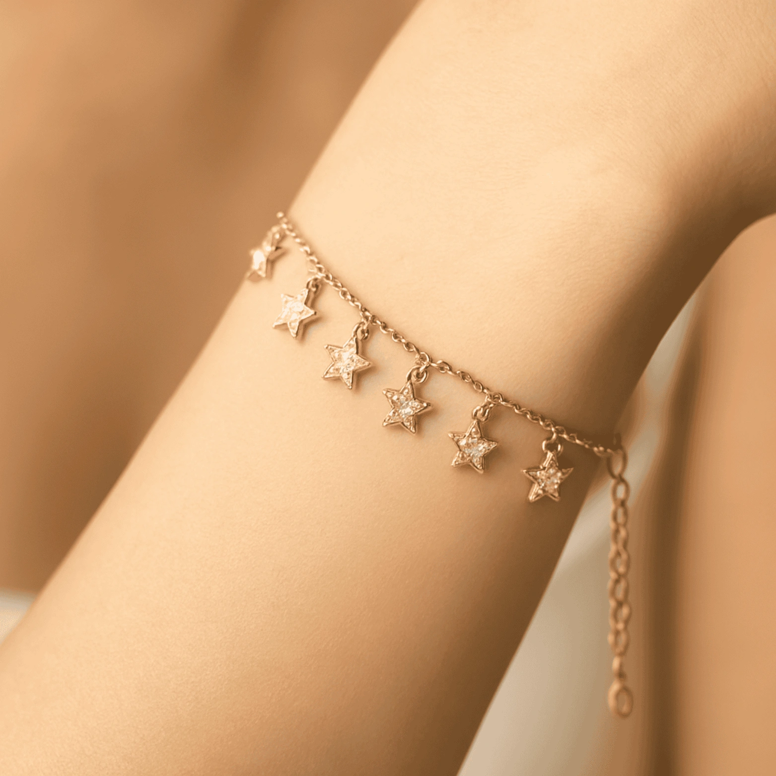 Crafted in 92.5 sterling silver with a radiant rose gold finish, this delicate charm bracelet features a string of star-shaped cubic zirconia charms that dance with every movement. The fine chain and adjustable clasp make it perfect for everyday wear or subtle statement styling. Light, ethereal, and effortlessly elegant.