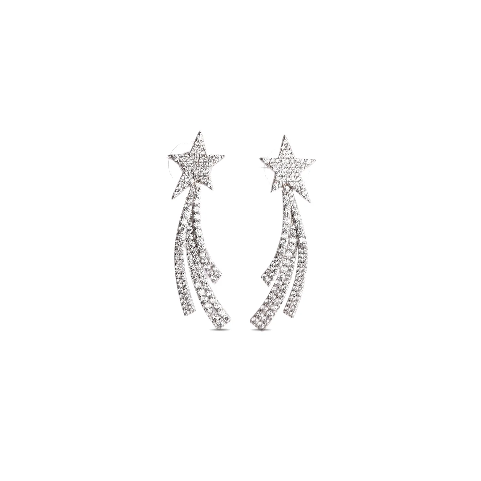 A captivating pair that channels the magic of the night sky, these 92.5 sterling silver earrings feature a striking star motif with a cascading comet-like trail encrusted in shimmering cubic zirconia. Designed to steal the spotlight, they add ethereal elegance to both day and night looks. Lightweight, radiant, and made to inspire stardust dreams.