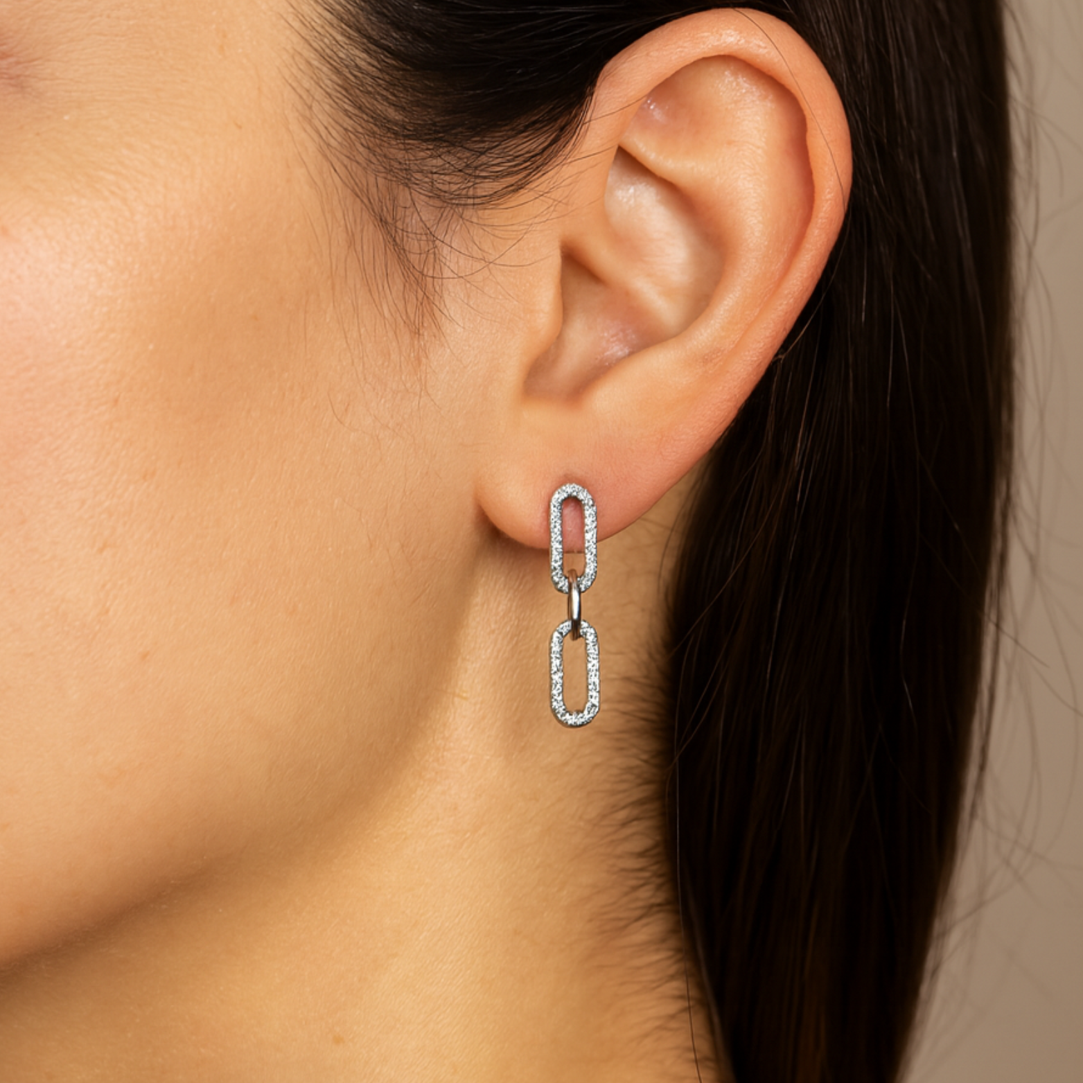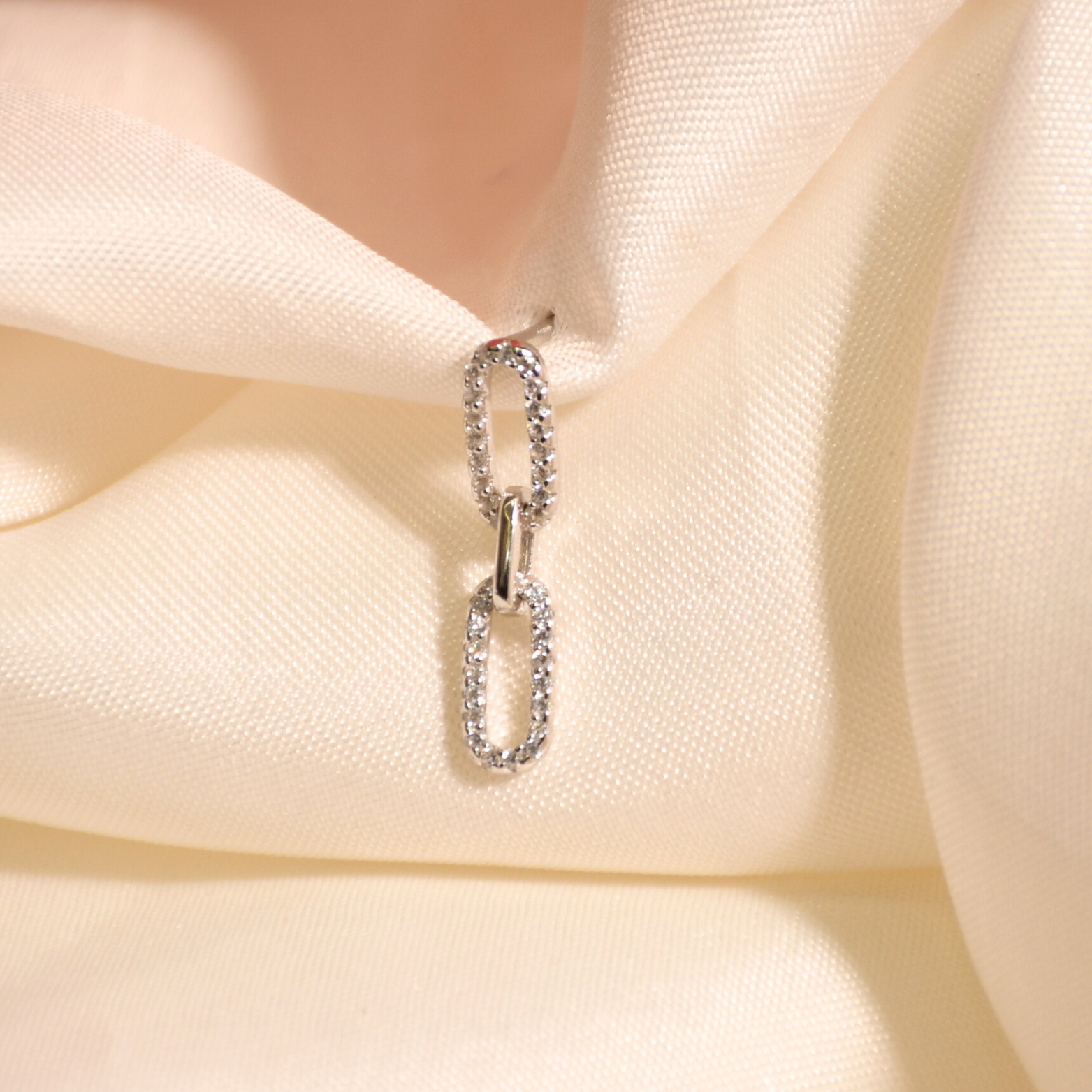 Crafted in 92.5 sterling silver, these statement double link drop earrings are designed for the modern woman who loves making a bold impression. The elongated interlinked oval design is fully encrusted with sparkling cubic zirconia stones, creating a perfect blend of contemporary style and timeless glamour. Lightweight yet impactful, these earrings transition effortlessly from day to night, making them ideal for parties, formal gatherings, or chic evening looks.