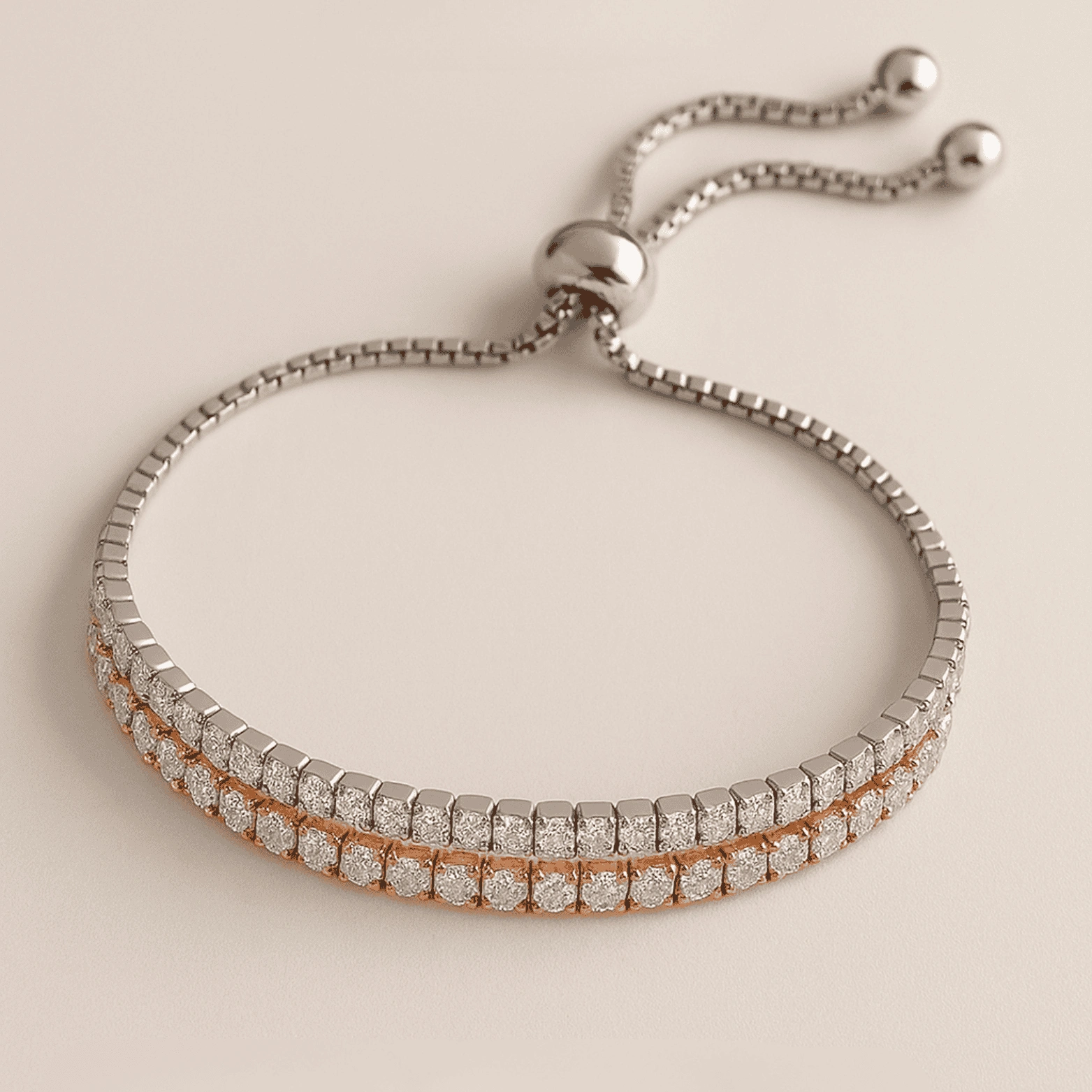 Design – Double-line tennis bracelet with alternating rose gold and silver-toned rows for a bold, elegant look