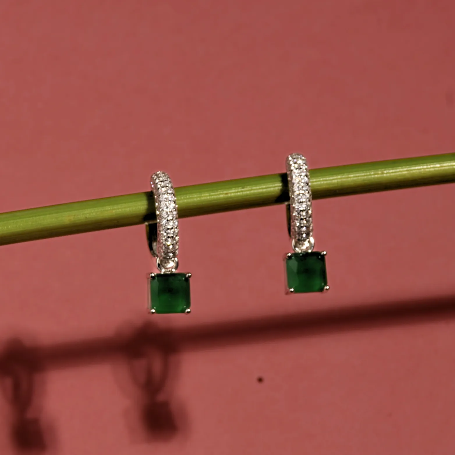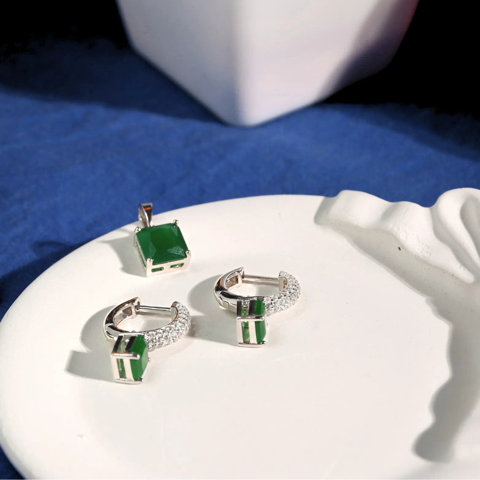 This set features a beautifully balanced square-cut emerald green stone pendant paired with matching earrings, each set in high-quality 92.5 sterling silver. The earrings gracefully curve with pavé detailing, making them as luxurious as they are wearable.