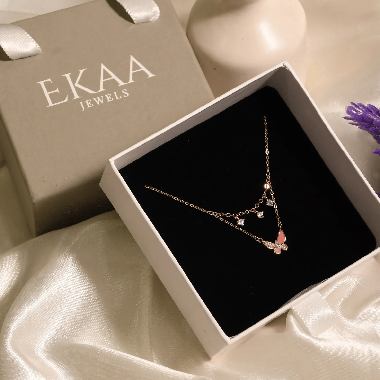 Crafted in 92.5 sterling silver with a luxurious rose gold finish, the Ekaa Enchanted Butterfly Necklace brings a fairytale charm to your neckline. Featuring a beautifully designed butterfly pendant with a mix of pink enamel and high-grade zirconia stones, this dual-layered chain adds a dreamy, feminine allure to any outfit. The dangling mini zircon charms on the upper chain add subtle sparkle with every movement. Perfect for adding a soft, elegant touch to both everyday and occasion wear.