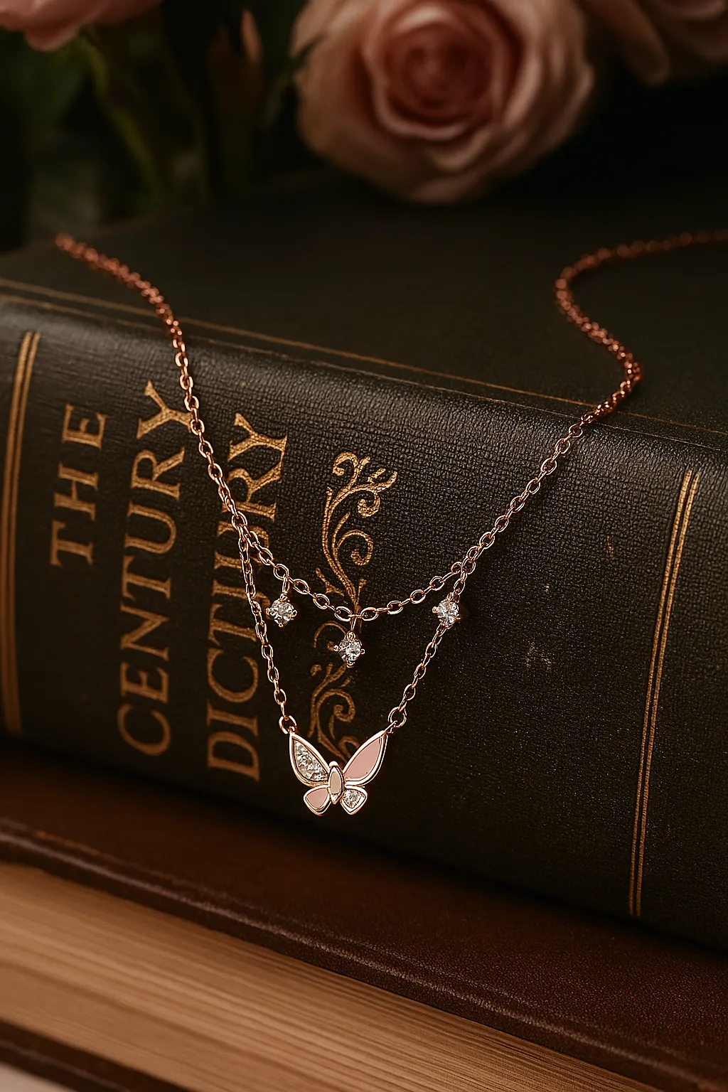 Delicate charm meets timeless elegance in this dual-chain butterfly necklace crafted in rose gold.