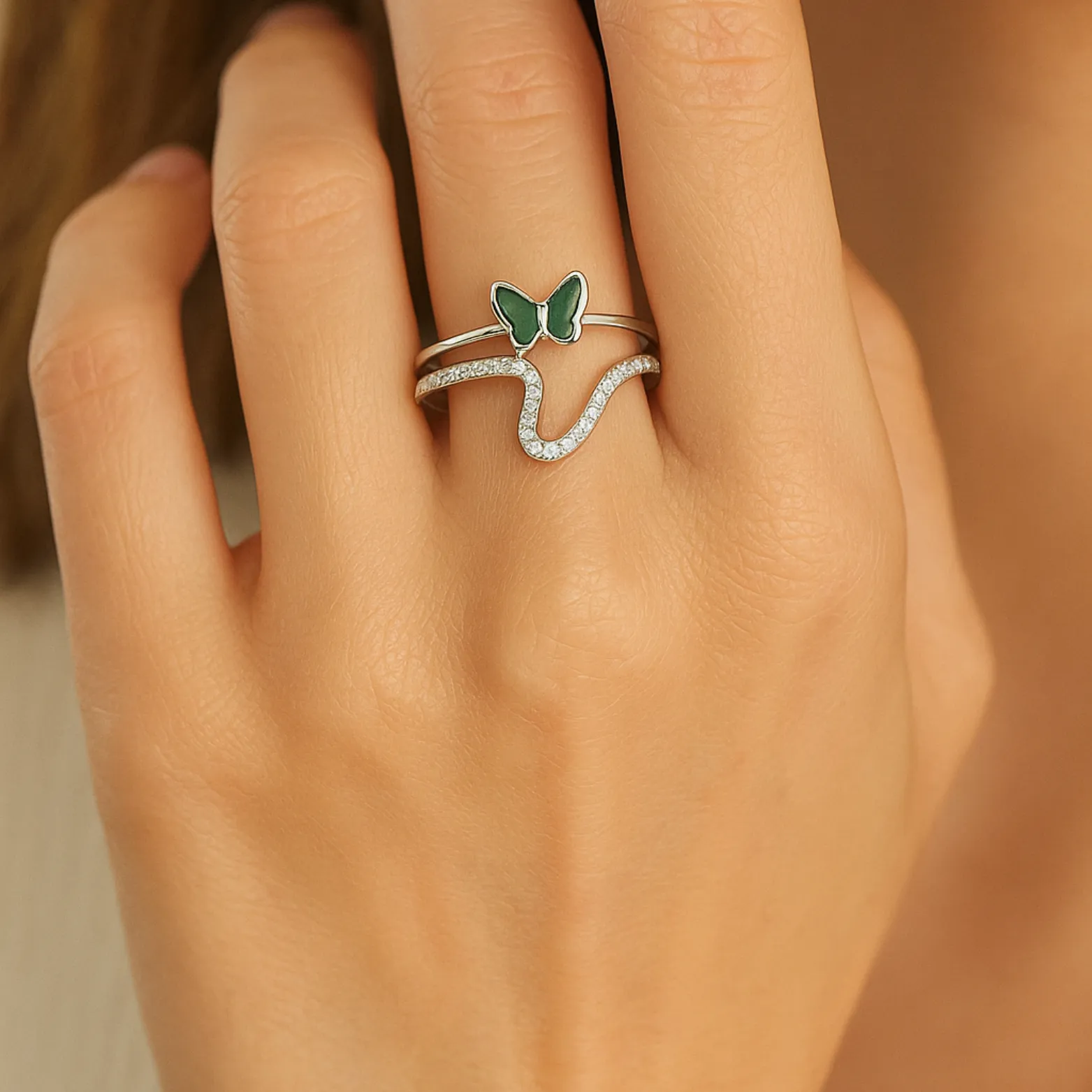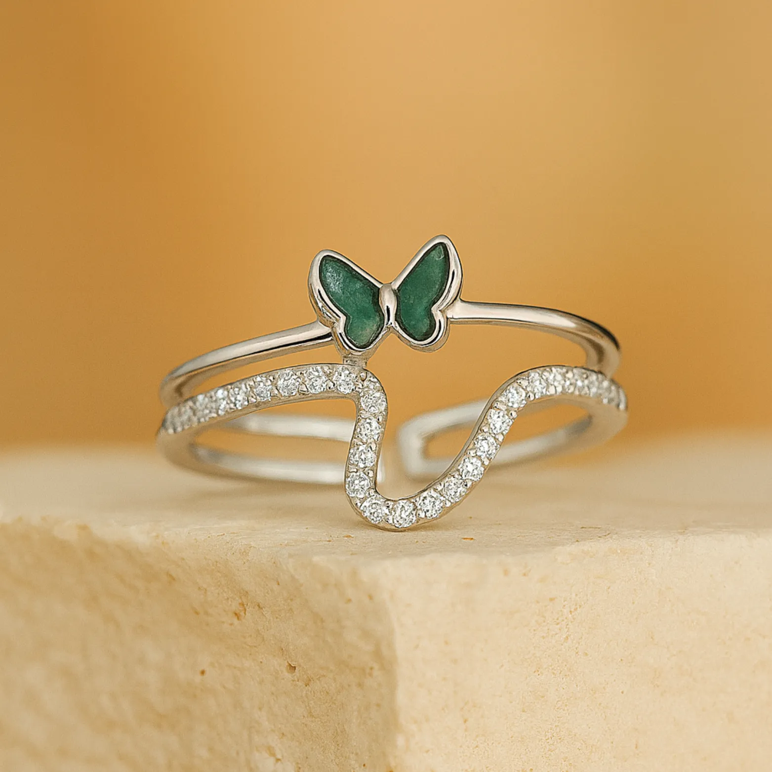 Design – Double-band ring with a wavy zircon-studded design and green butterfly centerpiece
