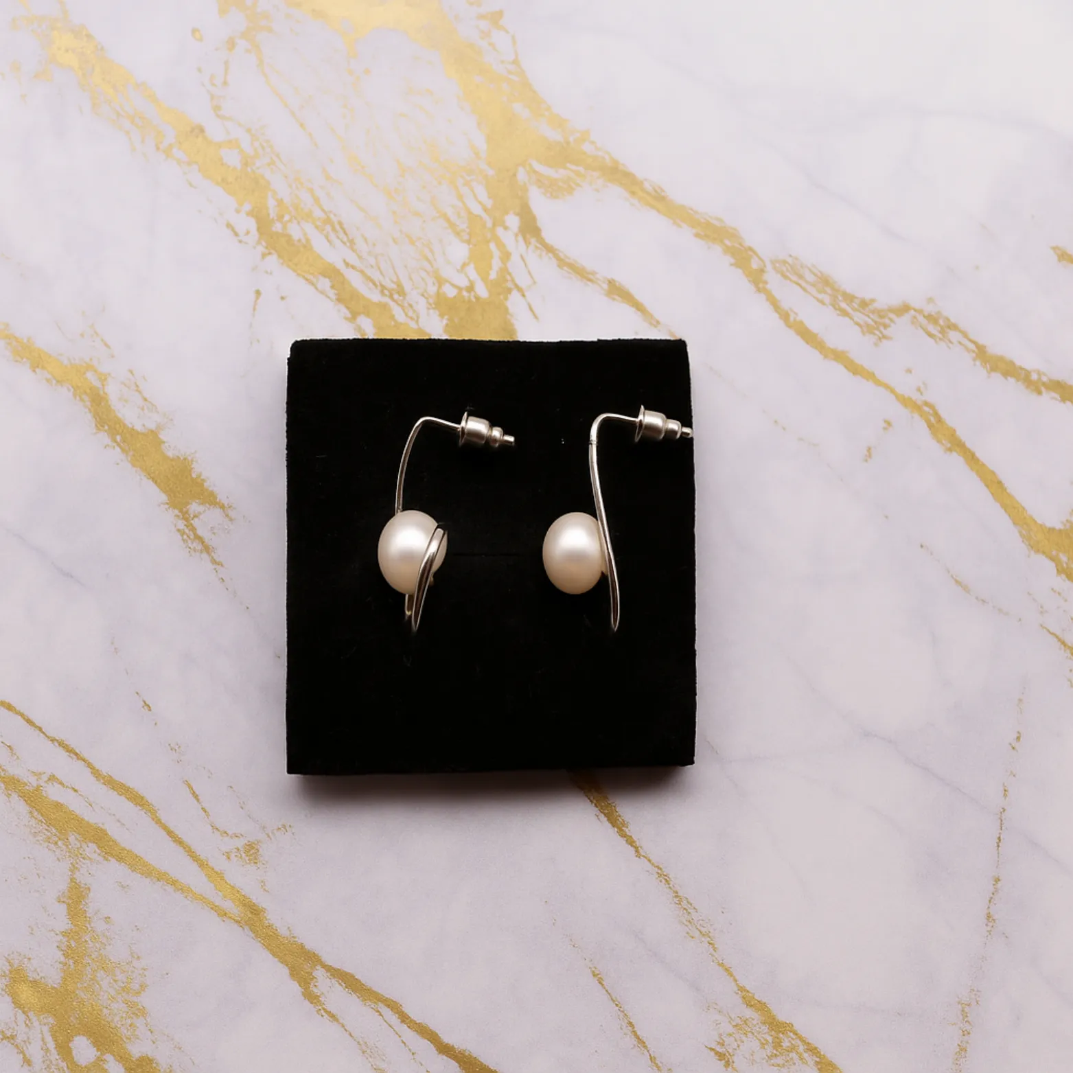 Crafted in pure 92.5 sterling silver, these ultra-modern drop earrings feature a fluid, sculptural curve that elegantly hugs a luminous pearl. The sleek design strikes a balance between simplicity and sophistication, making it perfect for contemporary women who love timeless elements with a twist. Whether paired with office wear or evening attire, these earrings add a refined charm that is subtle yet striking.