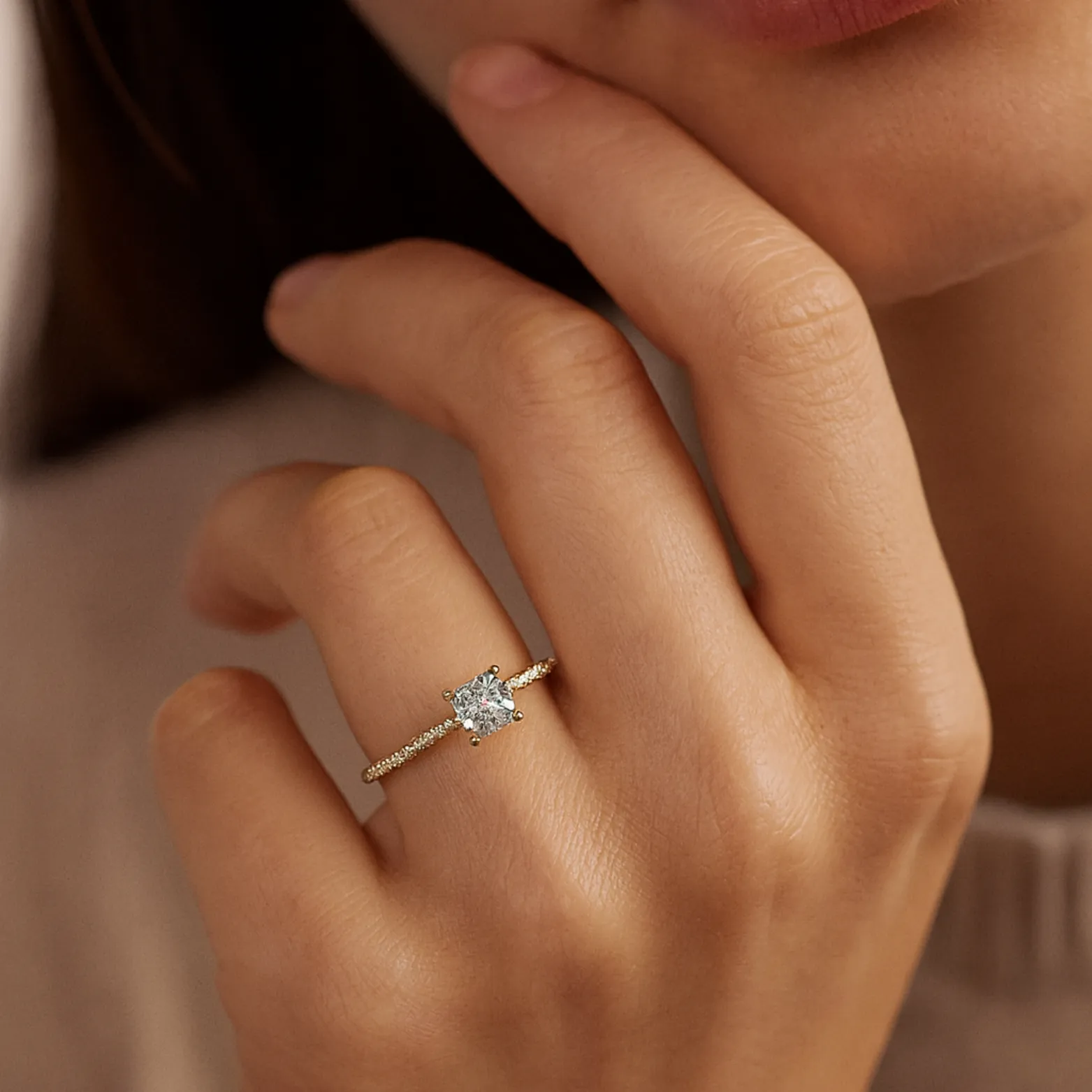 Design – Princess-cut solitaire centerpiece with a micro-studded stone band for added sparkle