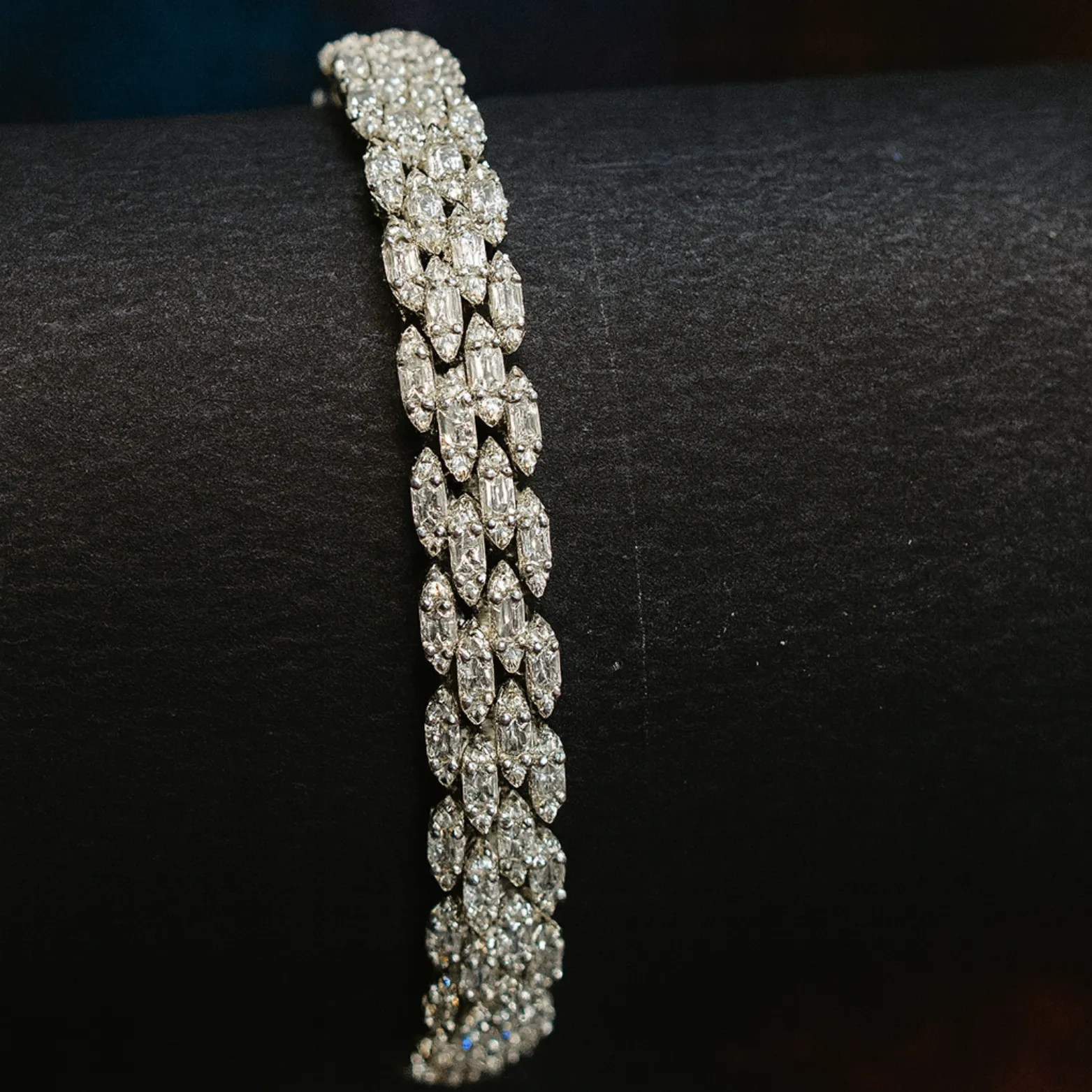 A dazzling cluster-style sterling silver bracelet with rows of shimmering cubic zirconia