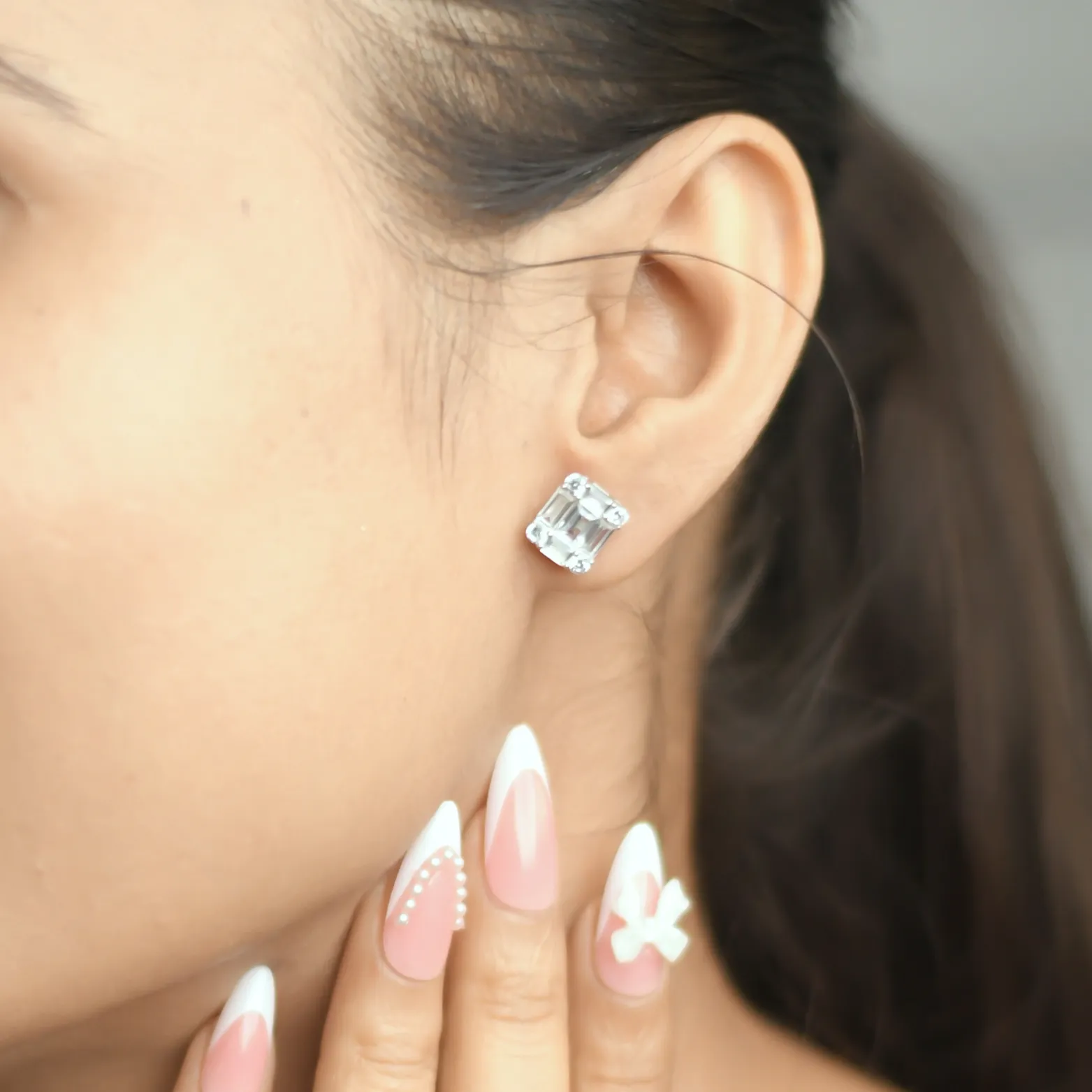 Design – Square-cut solitaire stud in a secure prong setting
