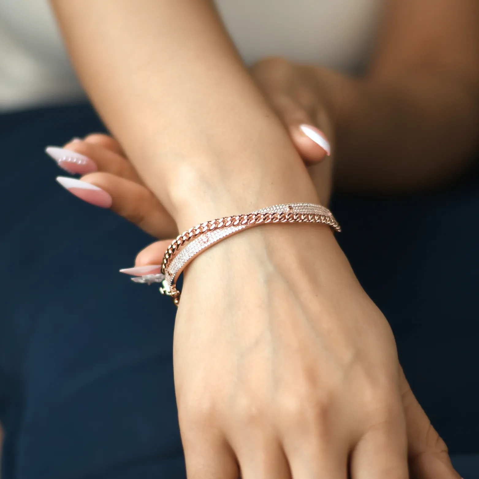 Elevate your style with our Rose Gold Silver Chain Detail Bracelet, crafted in 92.5 silver and adorned with delicate cubic zirconia stones. Featuring a unique dual-chain design alongside a shimmering stone-studded band, this bracelet blends bold elegance with modern sophistication. Perfect for everyday glam or special occasions, this piece secures with a hinged clasp for comfortable wear.