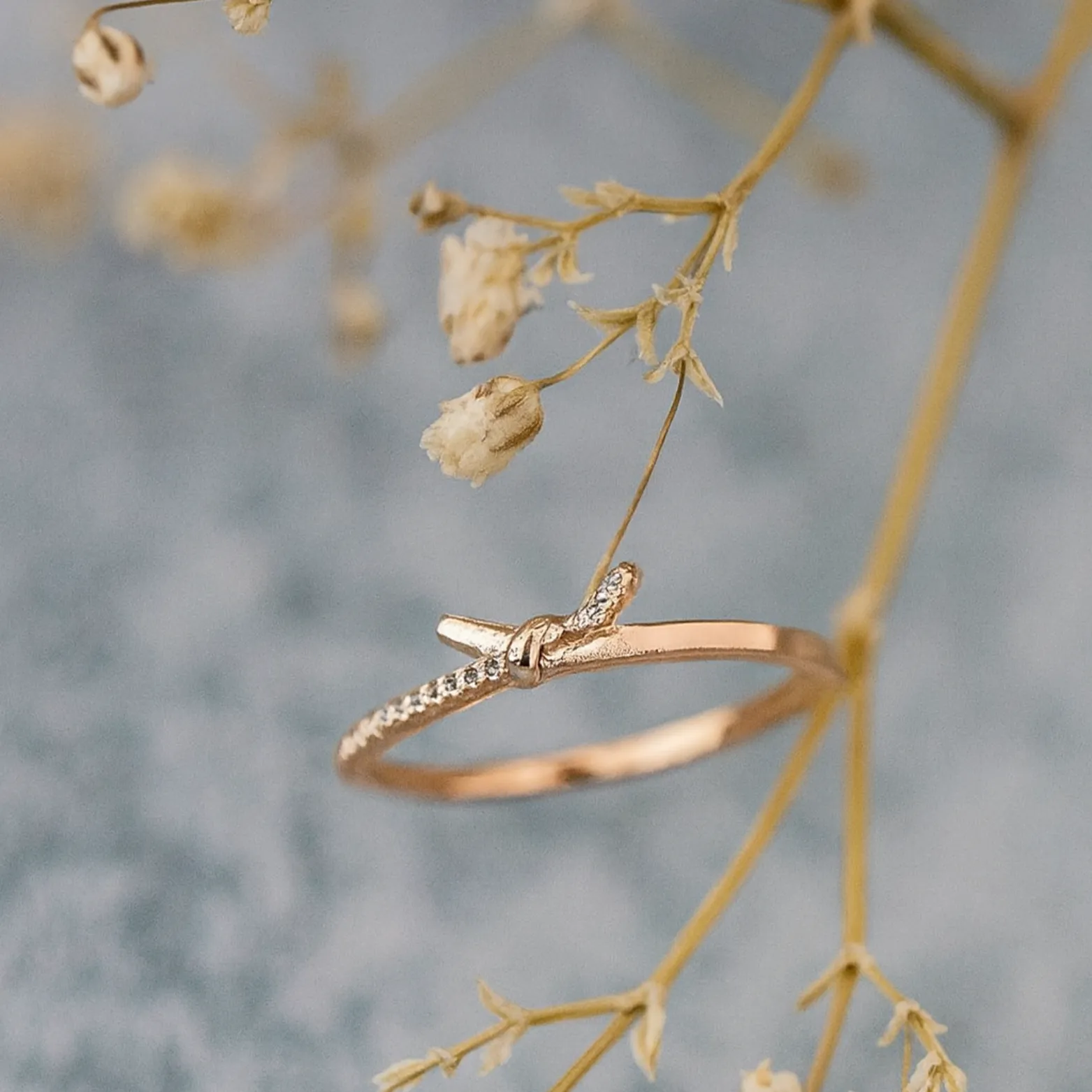A dainty rose gold bow knot ring with CZ sparkle, symbolizing elegance and love