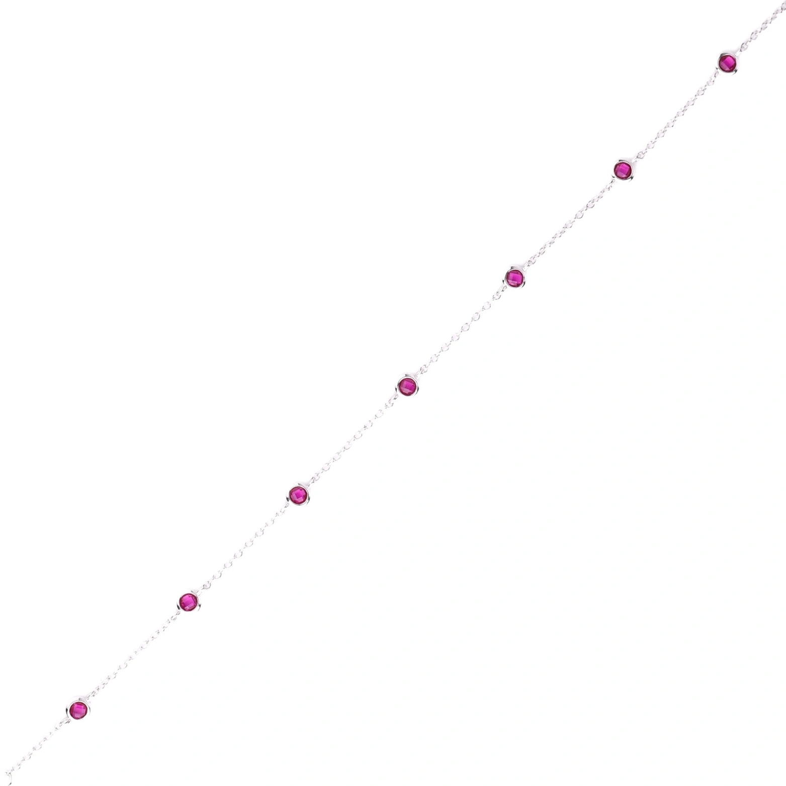 This minimalist 92.5 sterling silver bracelet features a dainty chain dotted with bezel-set ruby pink stones. Each stone is thoughtfully spaced to create a graceful rhythm of color and sparkle around the wrist. The adjustable extension ensures a comfortable, custom fit. Lightweight, elegant, and easy to layer or wear solo.