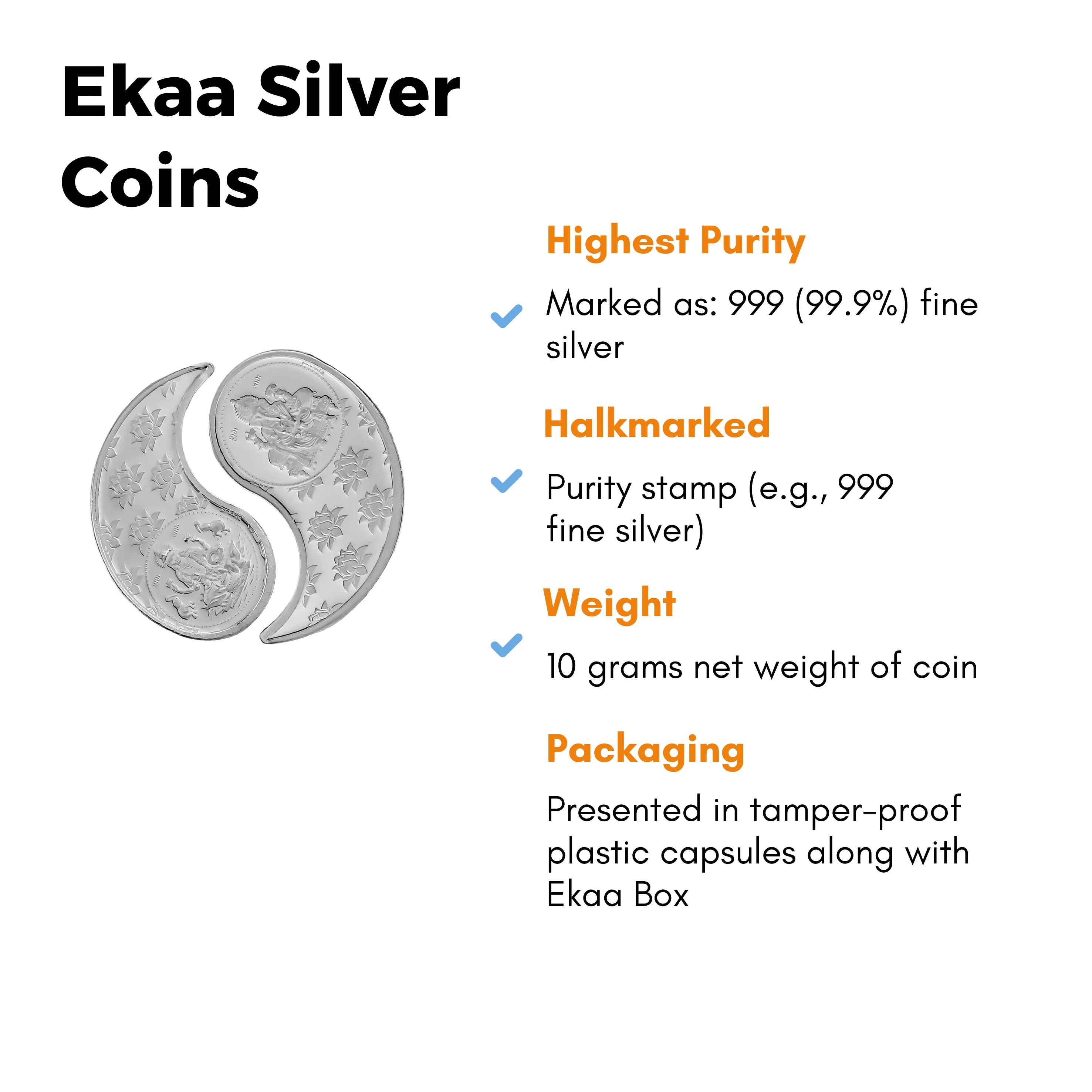 Celebrate harmony, spirituality, and abundance with the Ekaa Jewels Shri Lakshmi Ganesh Silver Coin, masterfully designed in a unique Yin-Yang shape and crafted from 99.9% pure fine silver.