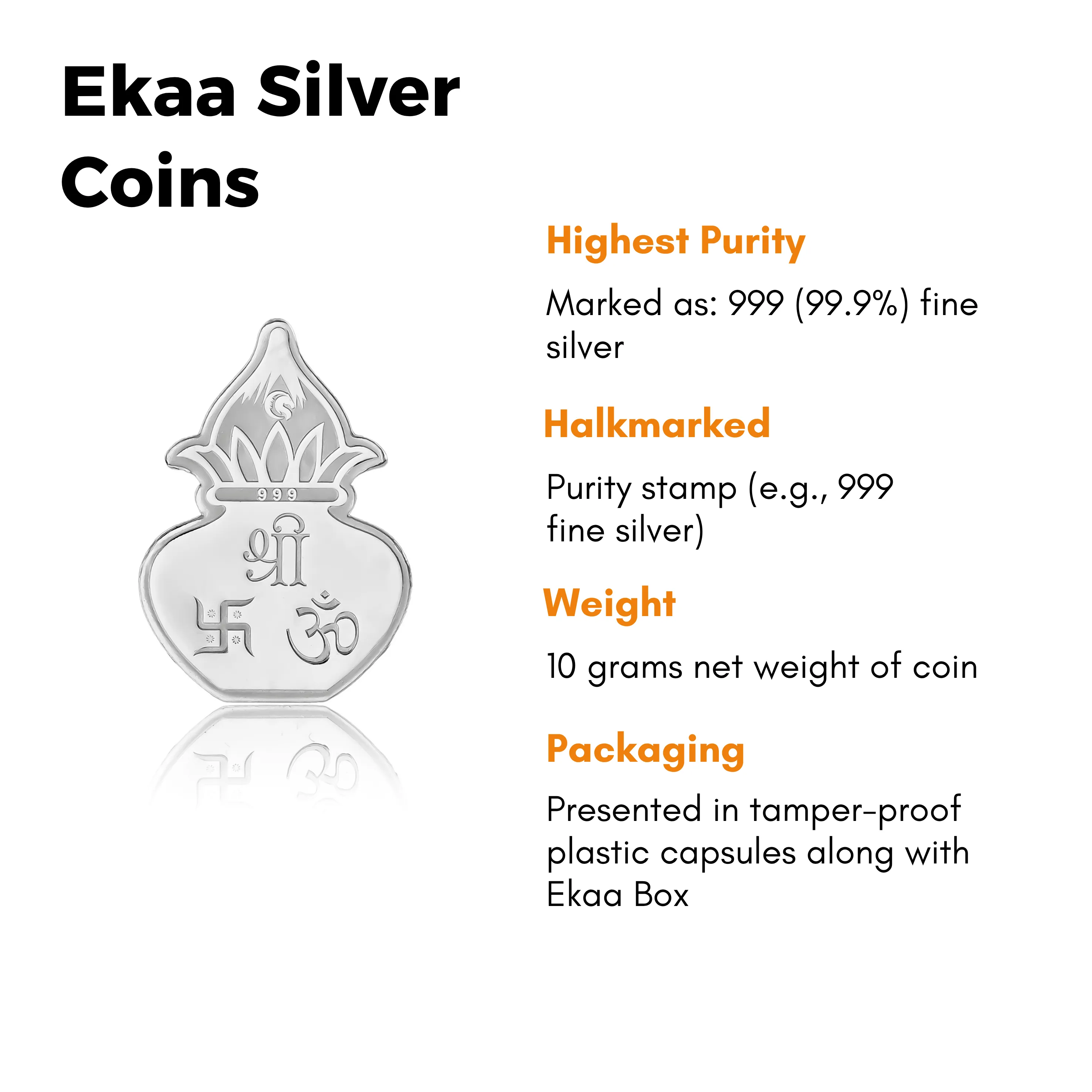 The Shri Lakshmi Ganesh Kalash Silver Coin by Ekaa Jewels is a divine masterpiece designed to invoke peace, prosperity, and positive energy in your home or workplace. Made with 99.9% pure silver, this coin features sacred engravings of Goddess Lakshmi, Lord Ganesha, and Kalash motifs, signifying abundance, success, and spiritual balance.