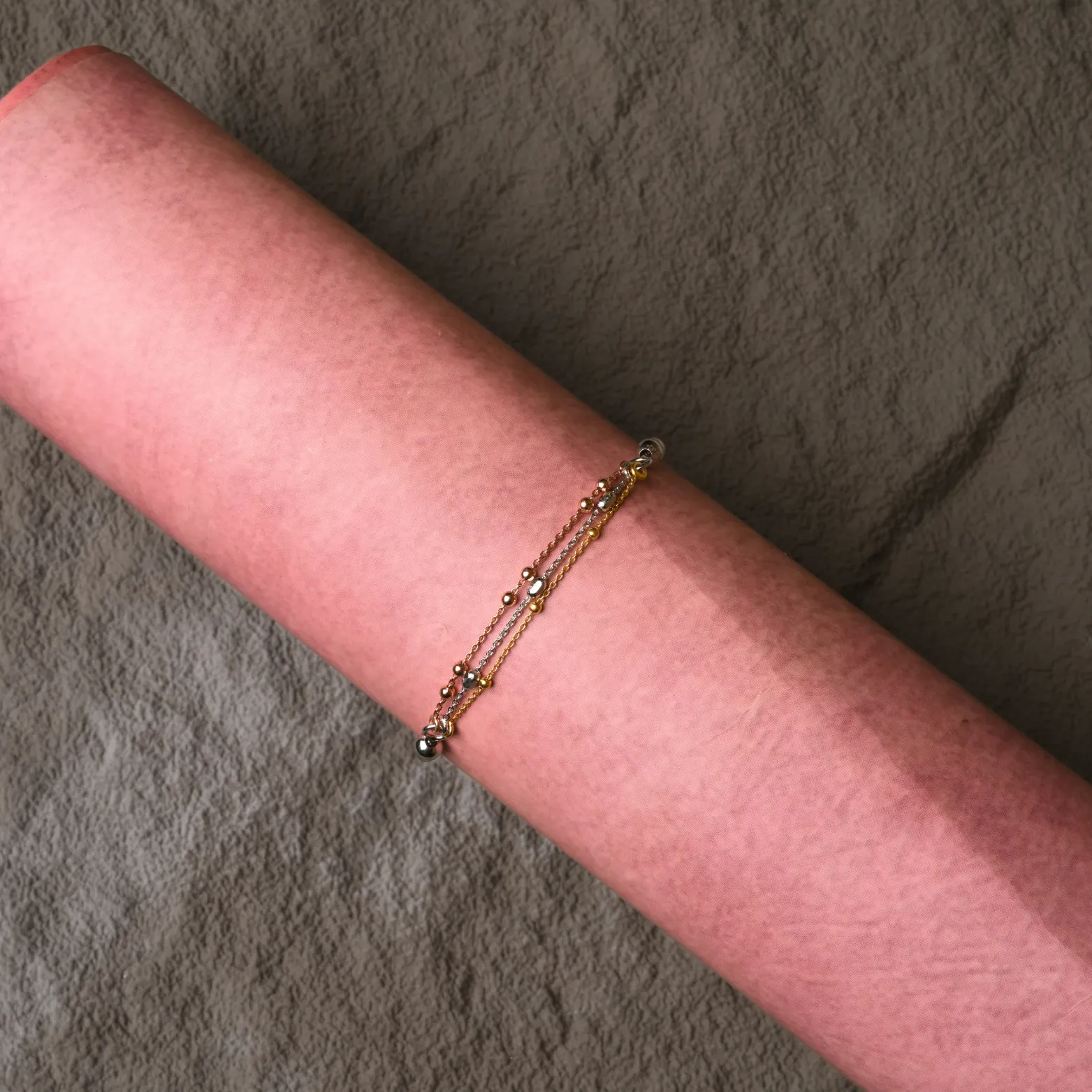 Design – Triple chain bracelet with metallic bead accents in three elegant tones