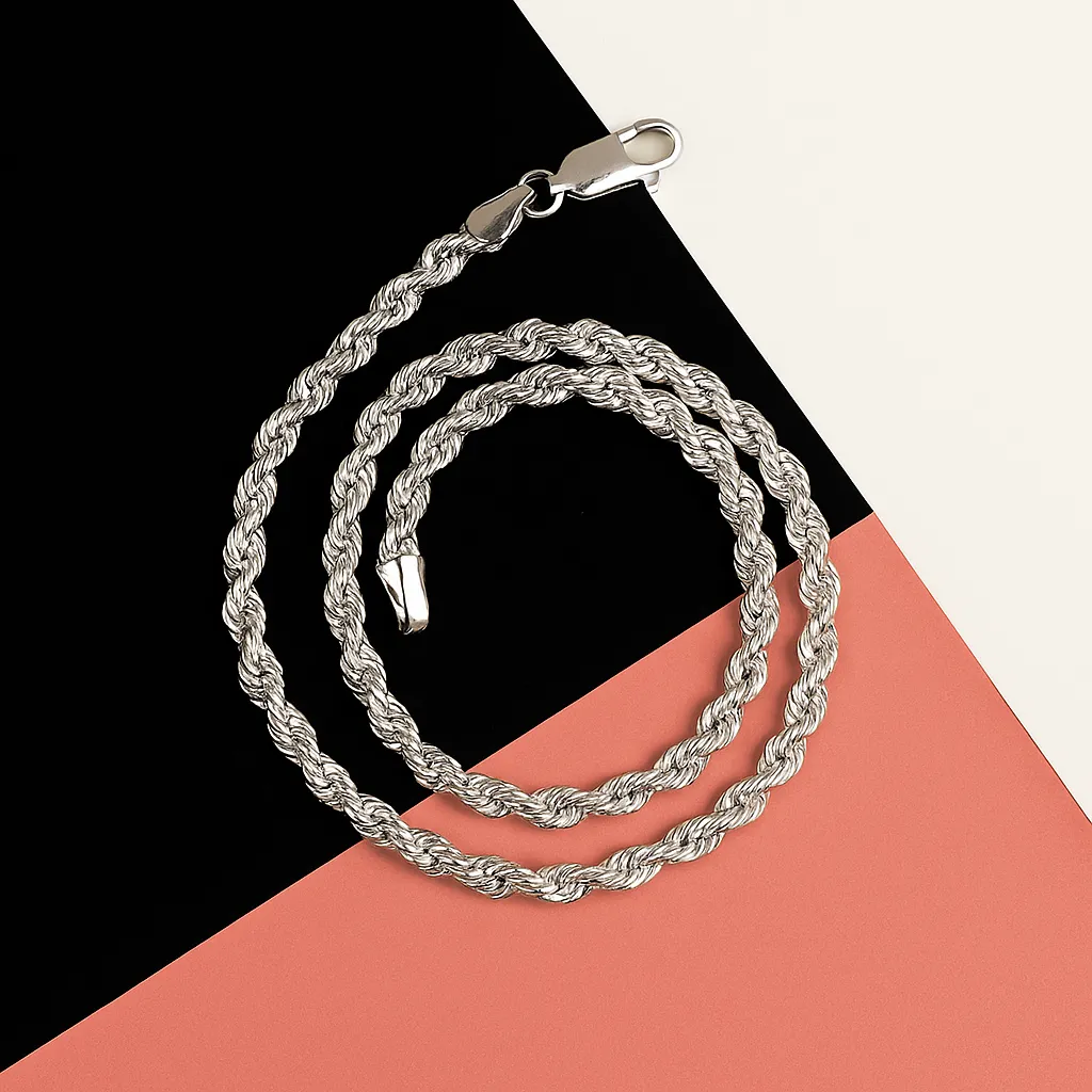 Add effortless edge and masculine charm to your look with this handcrafted 92.5 sterling silver rope chain. Designed for the modern man who values tradition and trend, this chain features a twisted rope-style weave that reflects light beautifully and complements both casual and formal wear. It’s a wardrobe essential – simple, solid, and undeniably stylish.