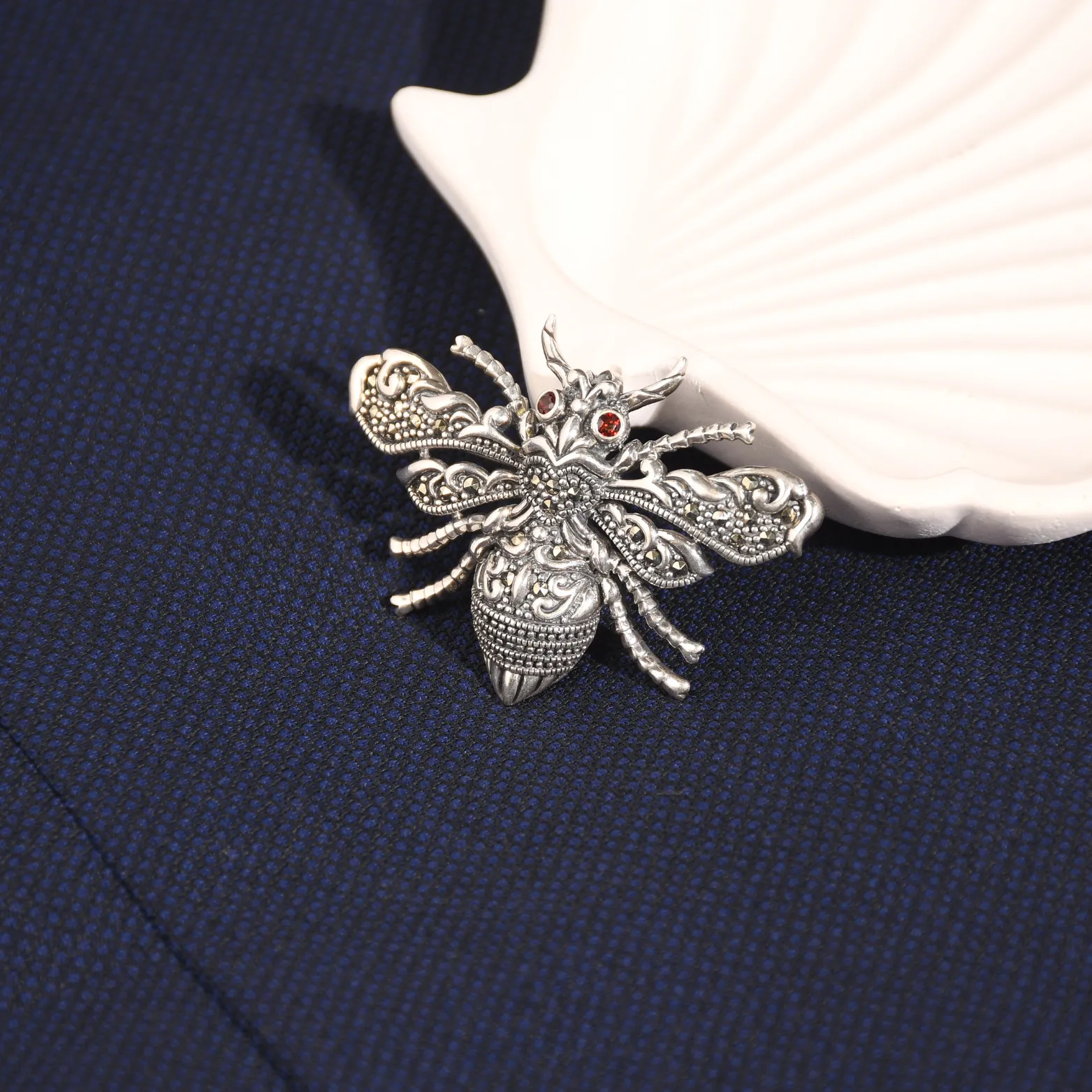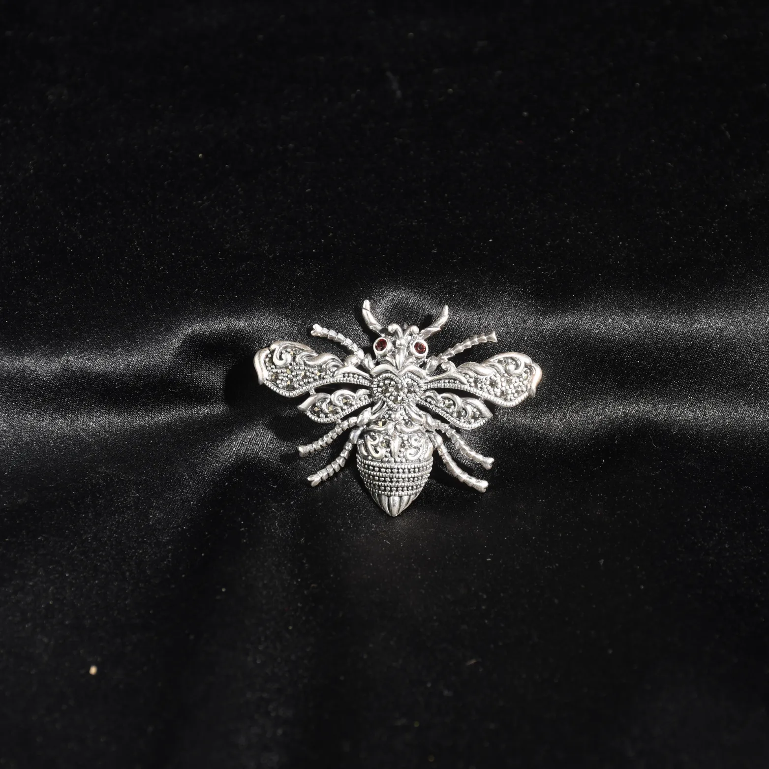 Command attention with this unique bee brooch crafted in 92.5 sterling silver and detailed with vintage marcasite sparkle. A symbol of hard work, strength, and royalty, the intricately designed wings, textured body, and red stone eyes add a striking presence to your ethnic or formal attire. Pair it with your bandhgala, sherwani, or blazer to make an unforgettable statement.