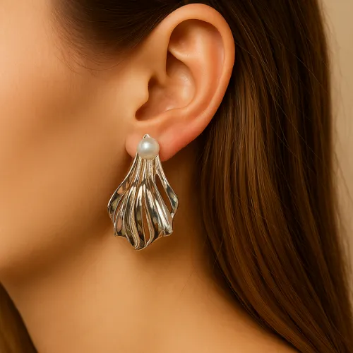 Inspired by the fluidity of waves and crowned with a classic pearl, these earrings are a statement of graceful sophistication. Crafted in 92.5 sterling silver with a brilliant silver polish, the flowing contours and gleaming surface reflect movement and light from every angle. The sculptural design, paired with a luminous pearl stud, makes these earrings a versatile companion for both festive wear and artistic styling. A wearable sculpture for the modern muse.
