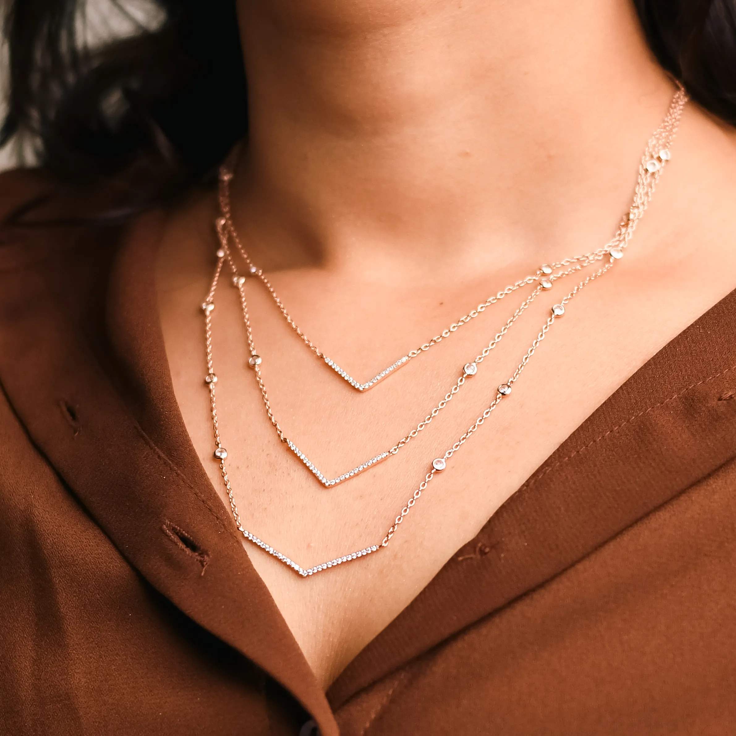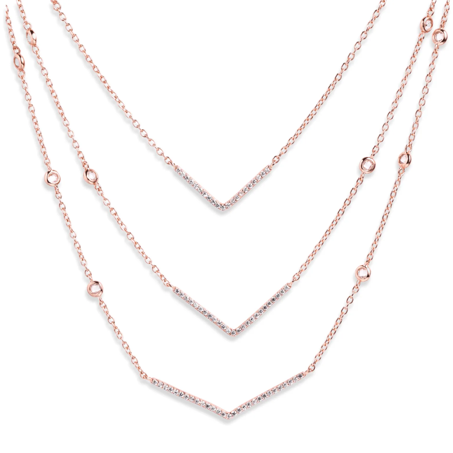 A statement of elegance – this rose gold triple-layered necklace dazzles with graceful curves and sparkling zircon.