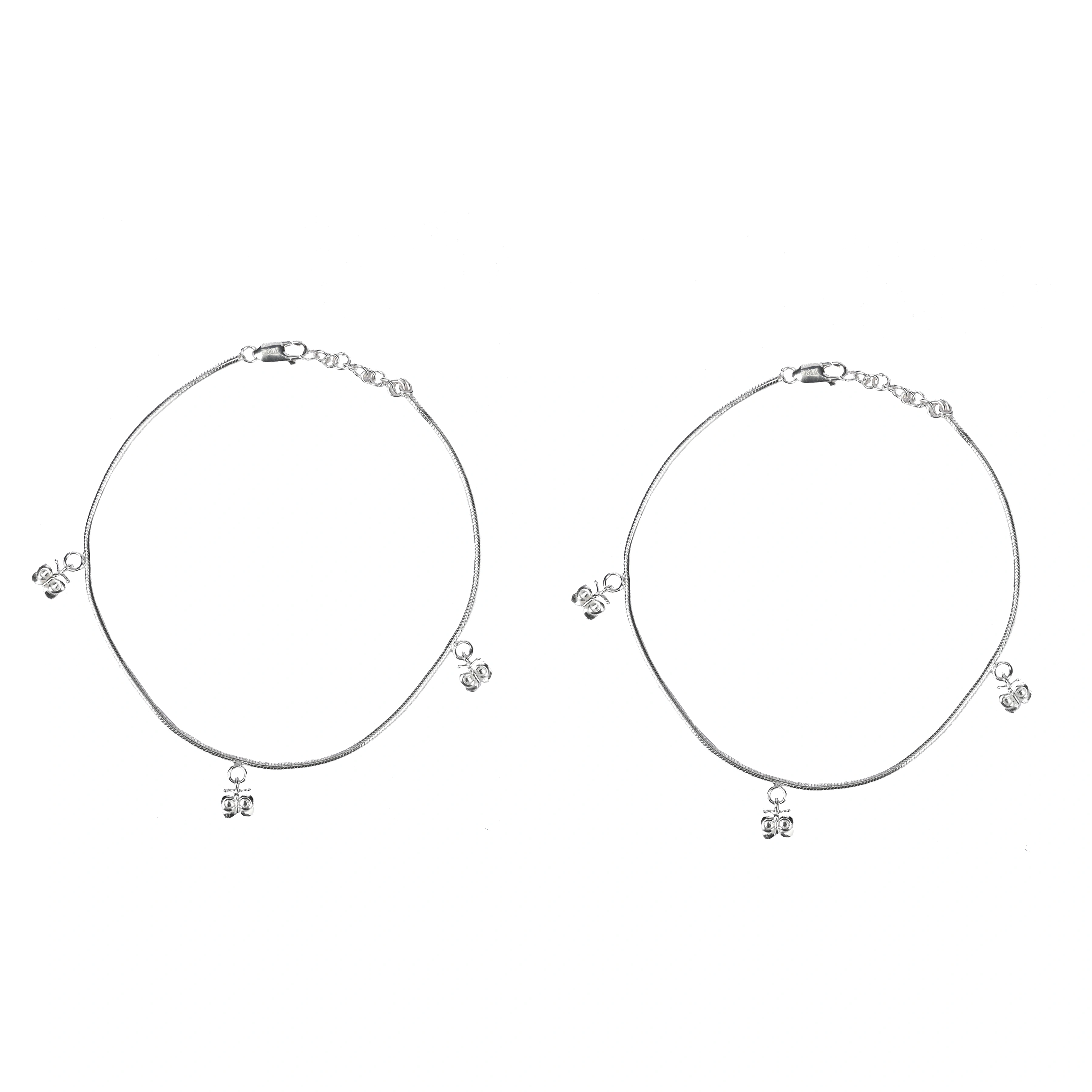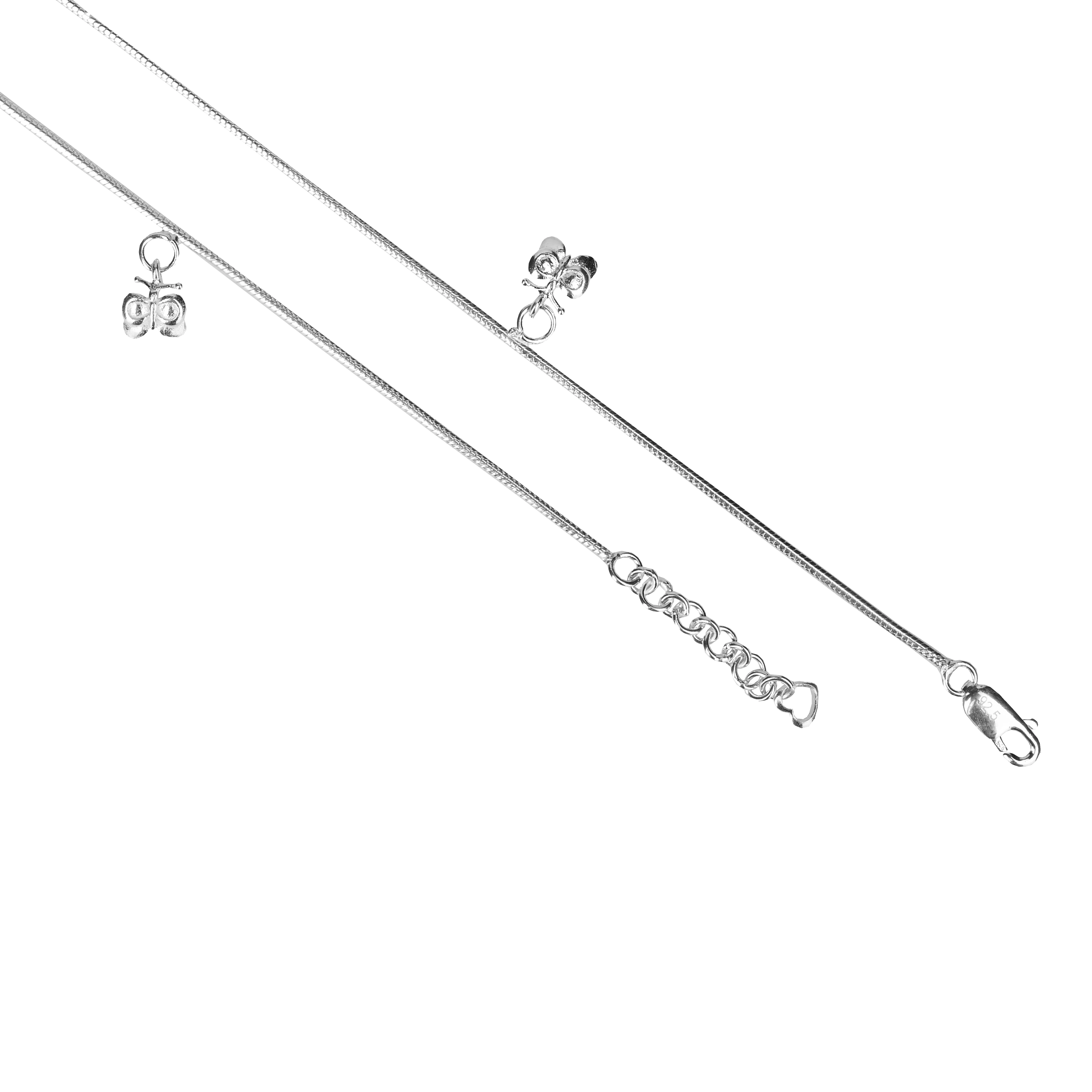 Let your ankles flutter with charm and elegance! These 92.5 pure silver anklets feature a refined Singapore rope chain adorned with dainty butterfly charms that symbolize freedom and femininity. Designed for comfort and daily elegance, this pair blends modern minimalism with a whimsical touch. Whether paired with ethnic attire or casual wear, they add a soft, graceful jingle and stylish charm to your step.