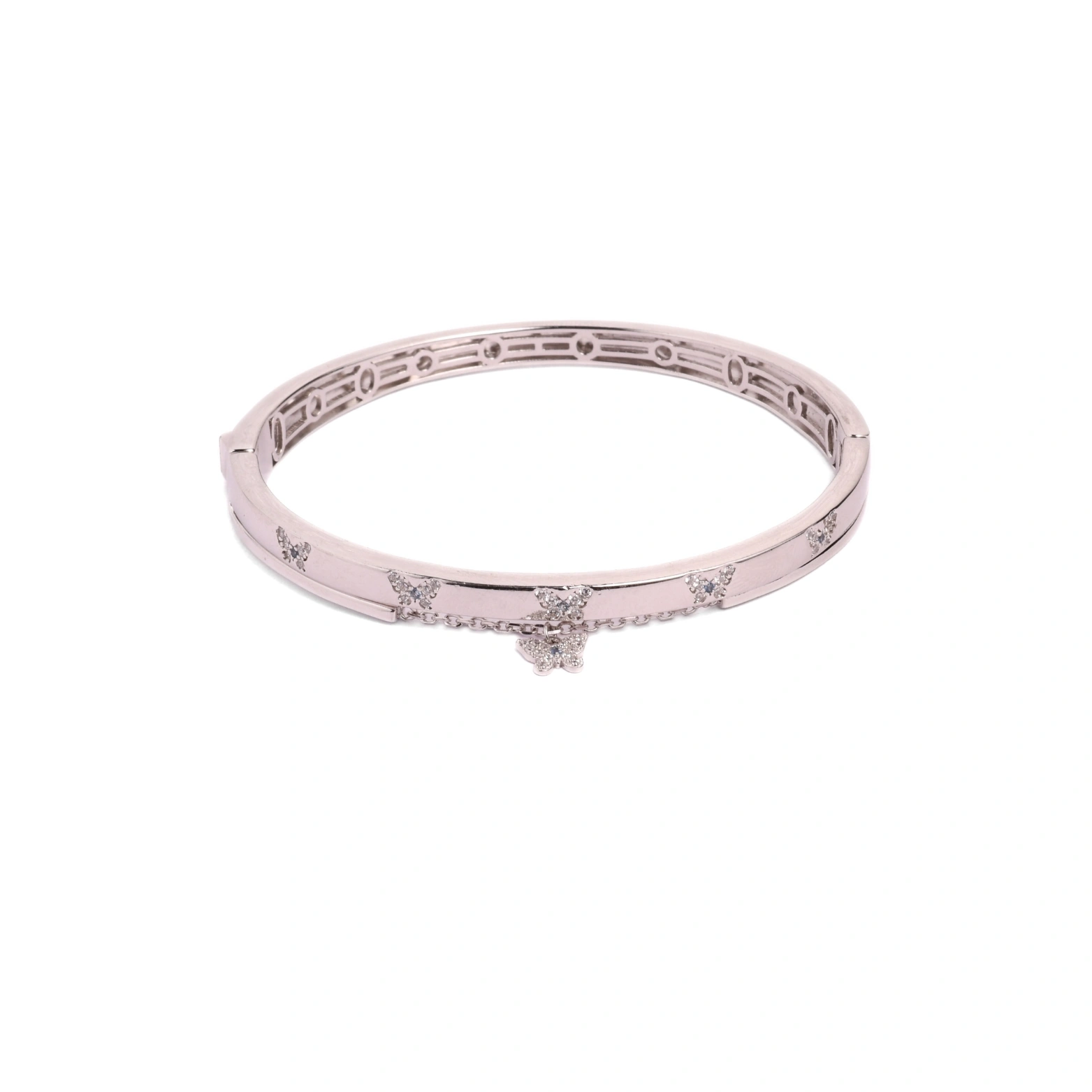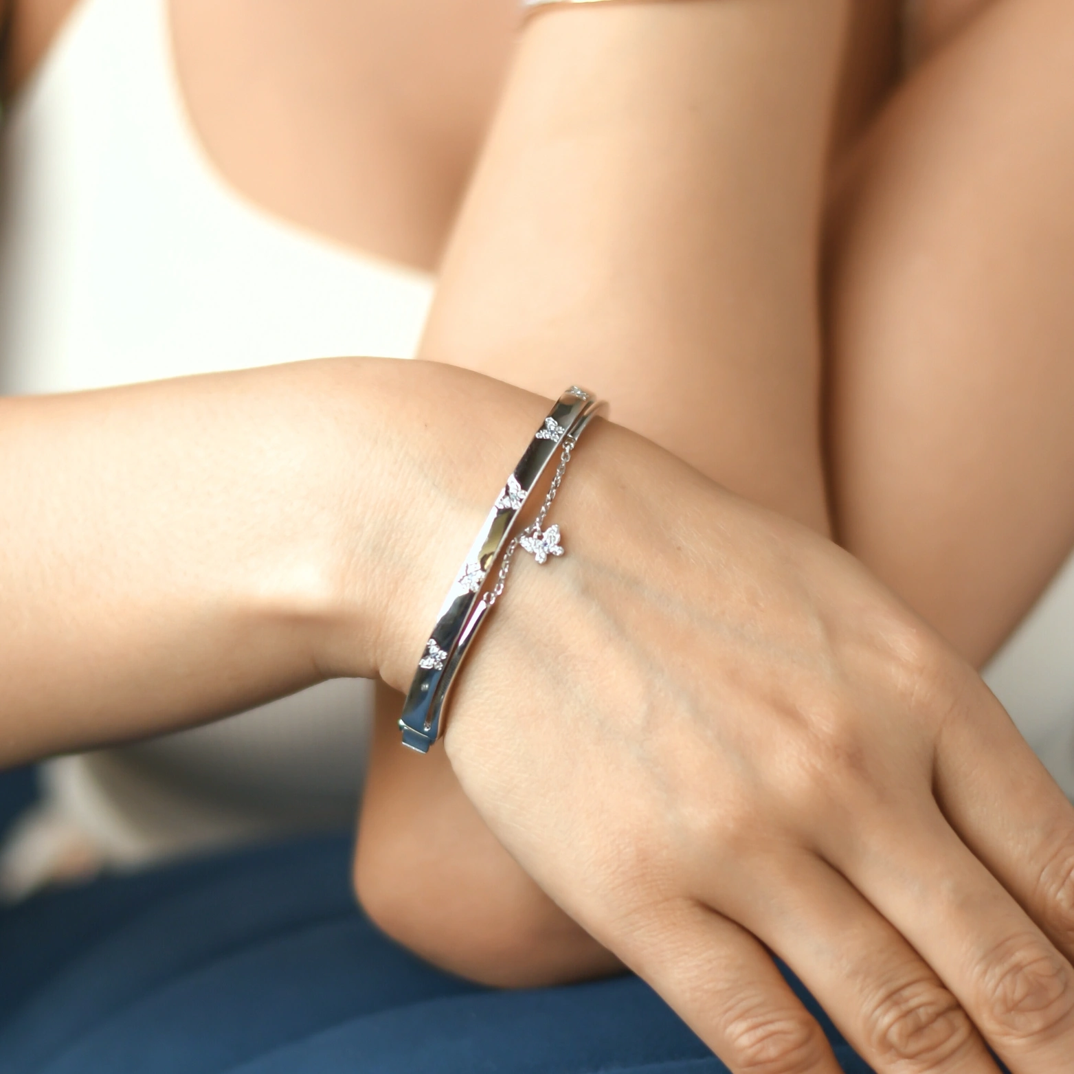 A sleek and elegant 92.5 silver kada bracelet featuring delicate butterfly motifs and a dainty chain charm. Designed for modern minimalism, this bracelet blends sophistication with playful charm, perfect for everyday luxury or special occasions.