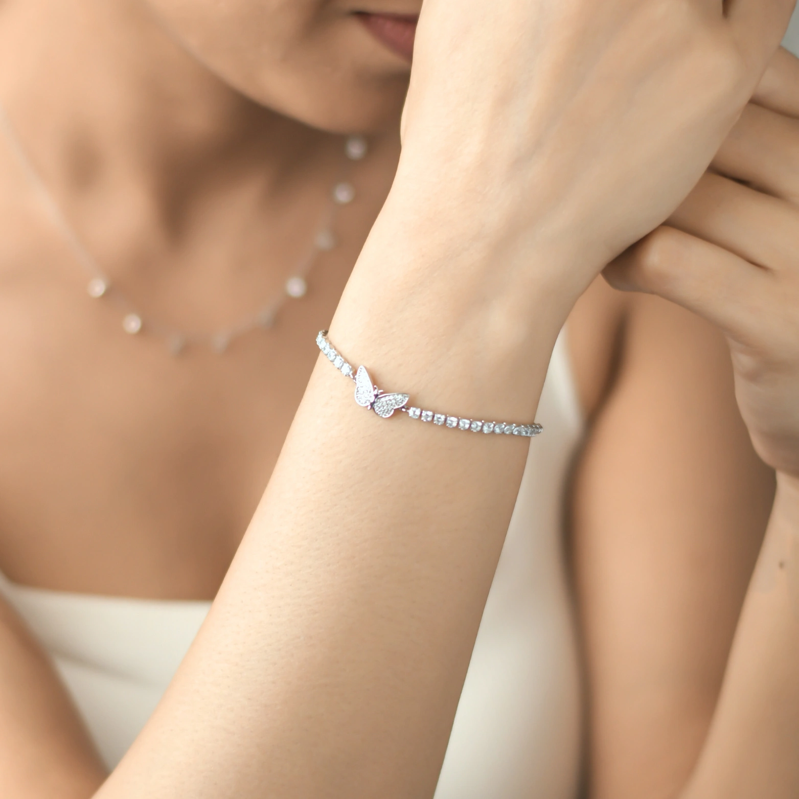Crafted in premium 92.5 sterling silver, this dazzling tennis bracelet features a beautifully detailed butterfly centerpiece encrusted with shimmering cubic zirconia. The classic line of sparkling stones adds a refined charm, while the adjustable sliding clasp ensures a perfect fit. Feminine, graceful, and versatile, this bracelet is the ideal choice for adding a hint of luxury to your everyday or special occasion outfits.