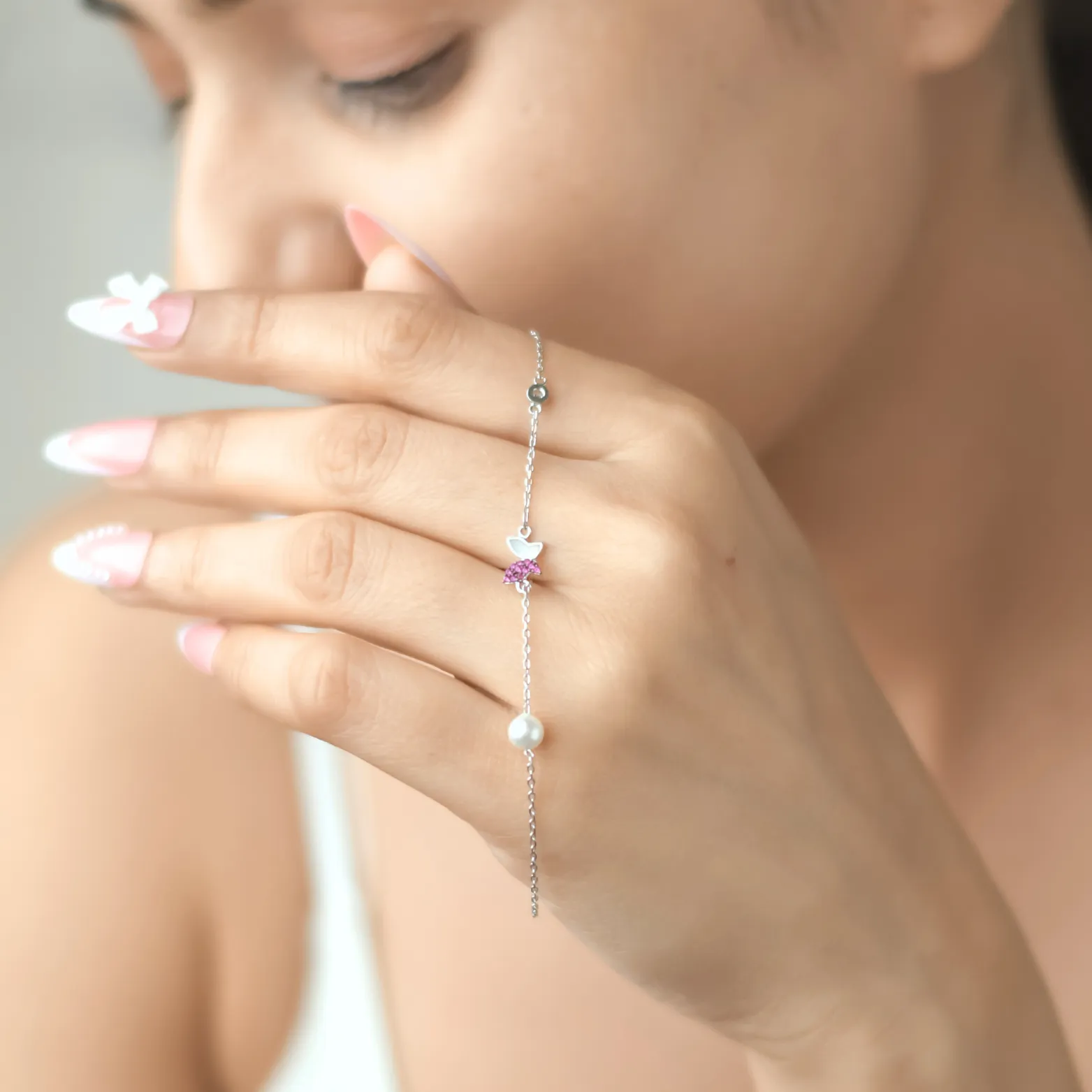 Crafted in 92.5 sterling silver, this elegant charm bracelet celebrates femininity and grace with its unique design. Featuring a dainty butterfly motif accented with pink stones, a luminous pearl, and a sparkling CZ, this bracelet captures the beauty of nature with a modern twist. Lightweight and stylish, it is perfect for layering with other bracelets or wearing solo for a subtle yet chic statement. A versatile piece designed for both everyday wear and special occasions.