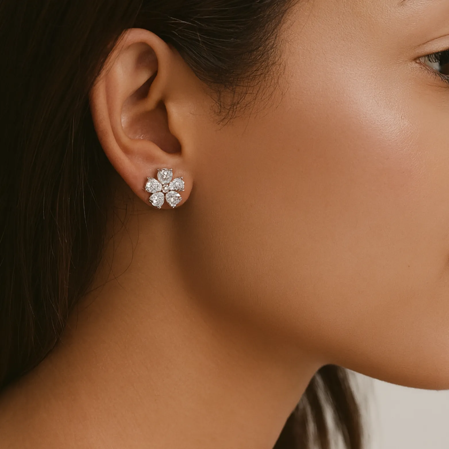 Each stud features a delicate five-petal floral design, accentuated with premium cubic zirconia stones that radiate brilliant sparkle from every angle.