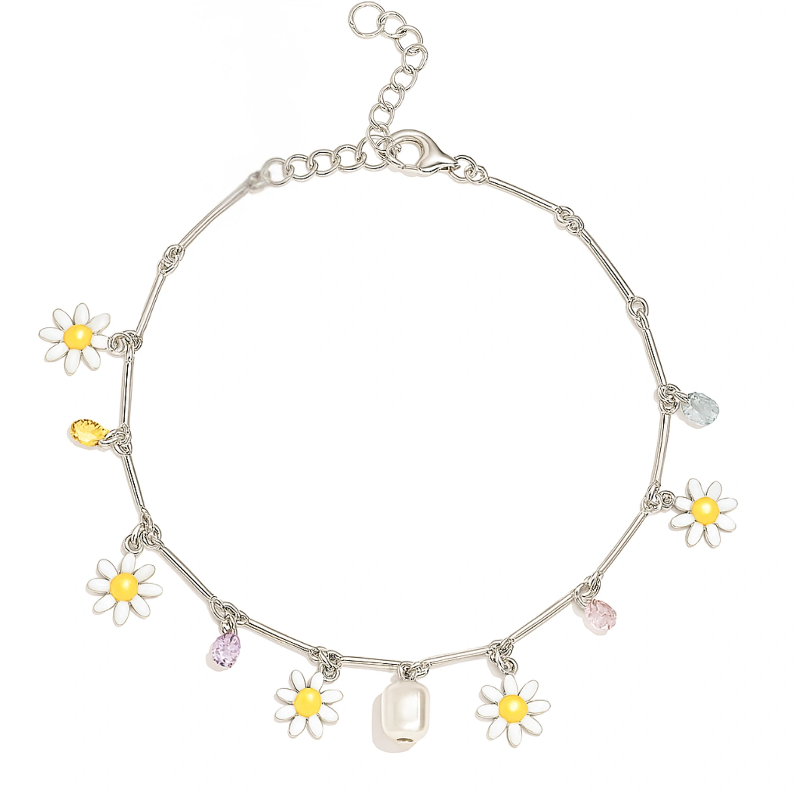 Design – Slim silver chain with daisy enamel charms, teardrop gemstones, and a pearl bead for a playful yet elegant look
