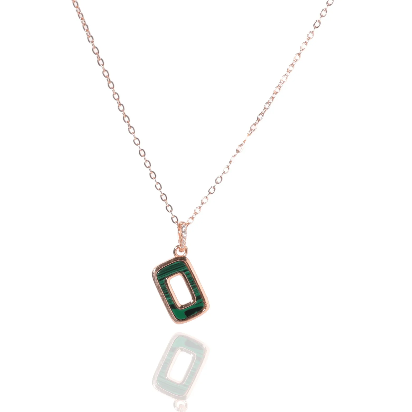 Design – Geometric rectangular charm in emerald green enamel with hollow center and CZ-accented bail