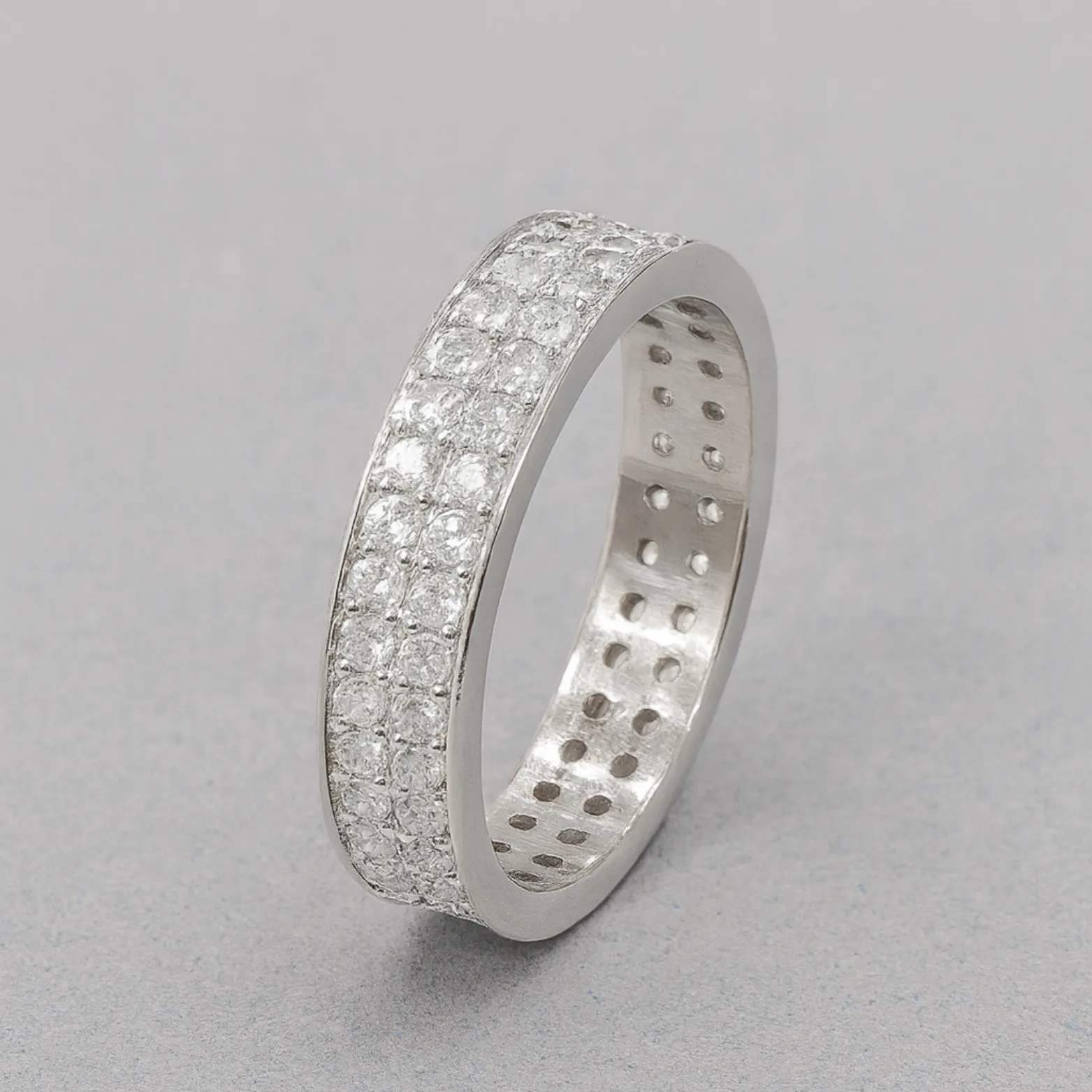 Crafted in 92.5 sterling silver, this elegant band ring is designed with rows of meticulously set cubic zirconia stones that shine endlessly. Its wide design adds a luxurious touch, making it an ideal choice for statement styling or as a timeless symbol of love. Comfortable to wear and effortlessly glamorous, this ring is perfect for both everyday sparkle and special occasions.