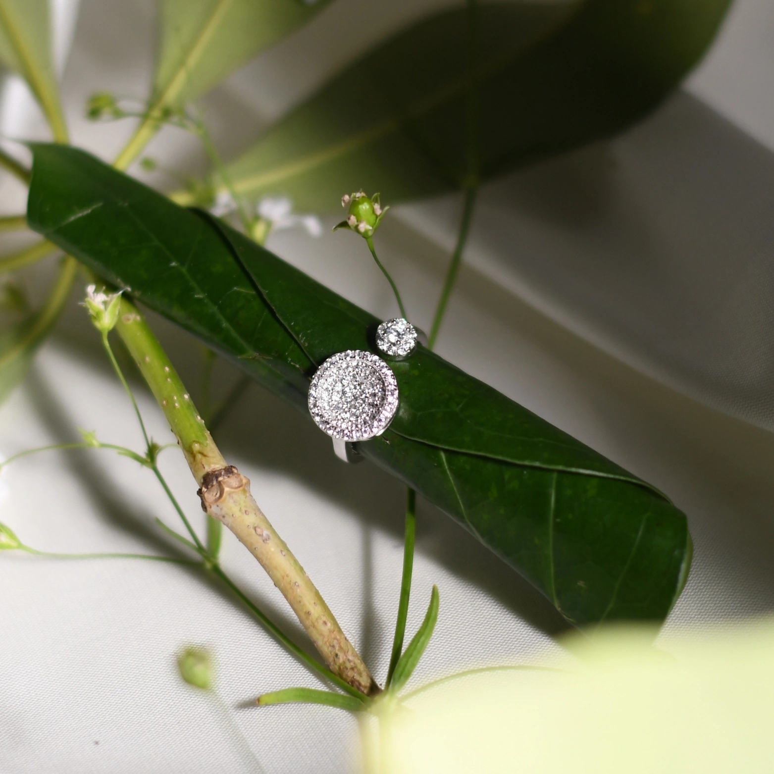 The Luna Halo Ring is a contemporary open-ended design crafted in 92.5 sterling silver, featuring dual pavé-studded discs—one large, one small. Its dazzling concentric pattern and asymmetrical charm make it the perfect blend of statement and sophistication. Lightweight, adjustable, and endlessly radiant.