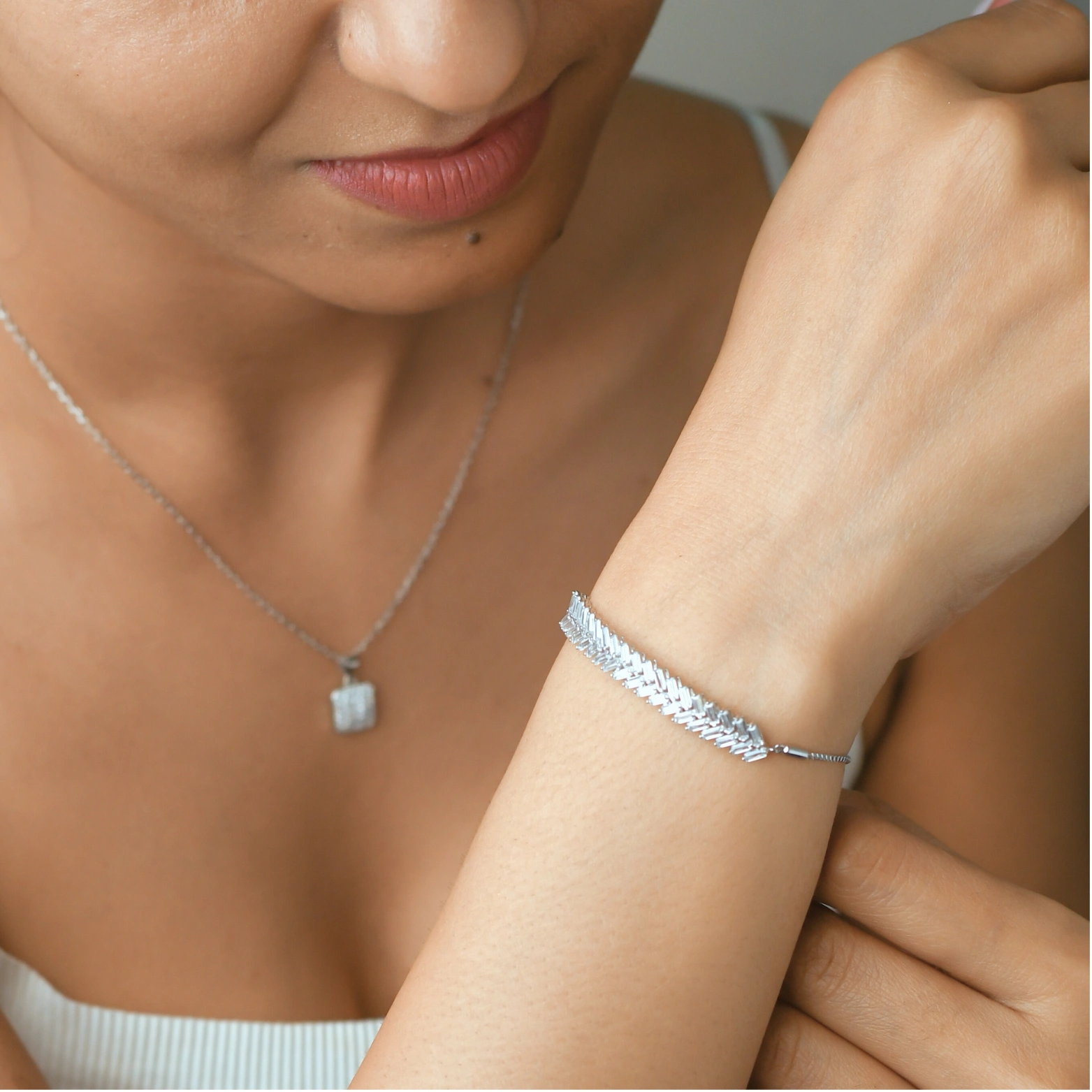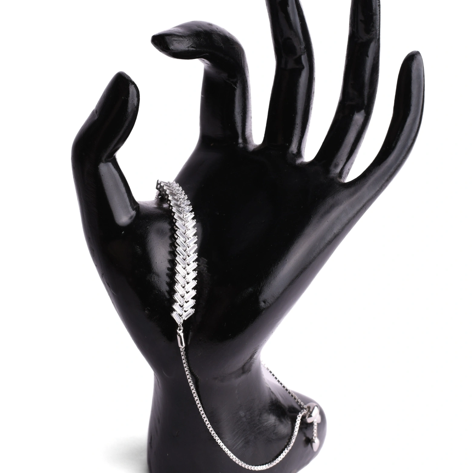 A modern marvel in 92.5 sterling silver, the Luxe Lattice Bracelet features a striking zigzag pattern of baguette-cut cubic zirconia stones set in a sleek, adjustable slider chain. Designed for both comfort and glamour, this piece delivers an effortless sparkle that adapts to your style, whether stacked or solo.