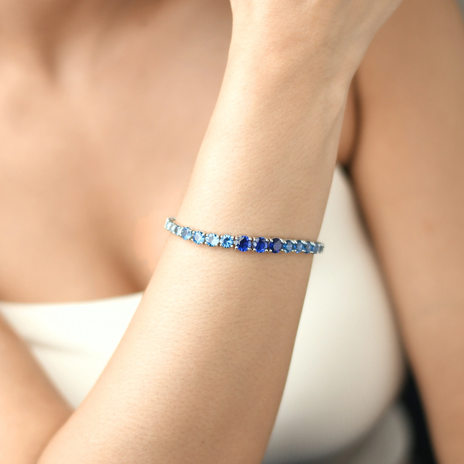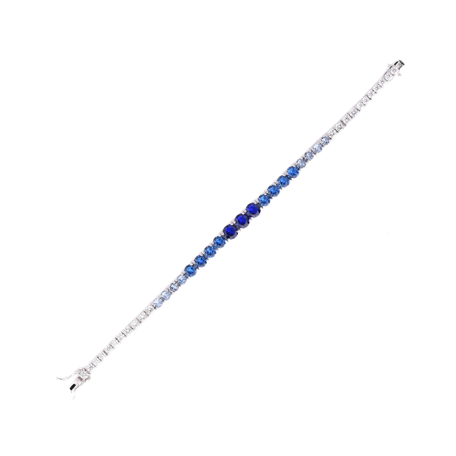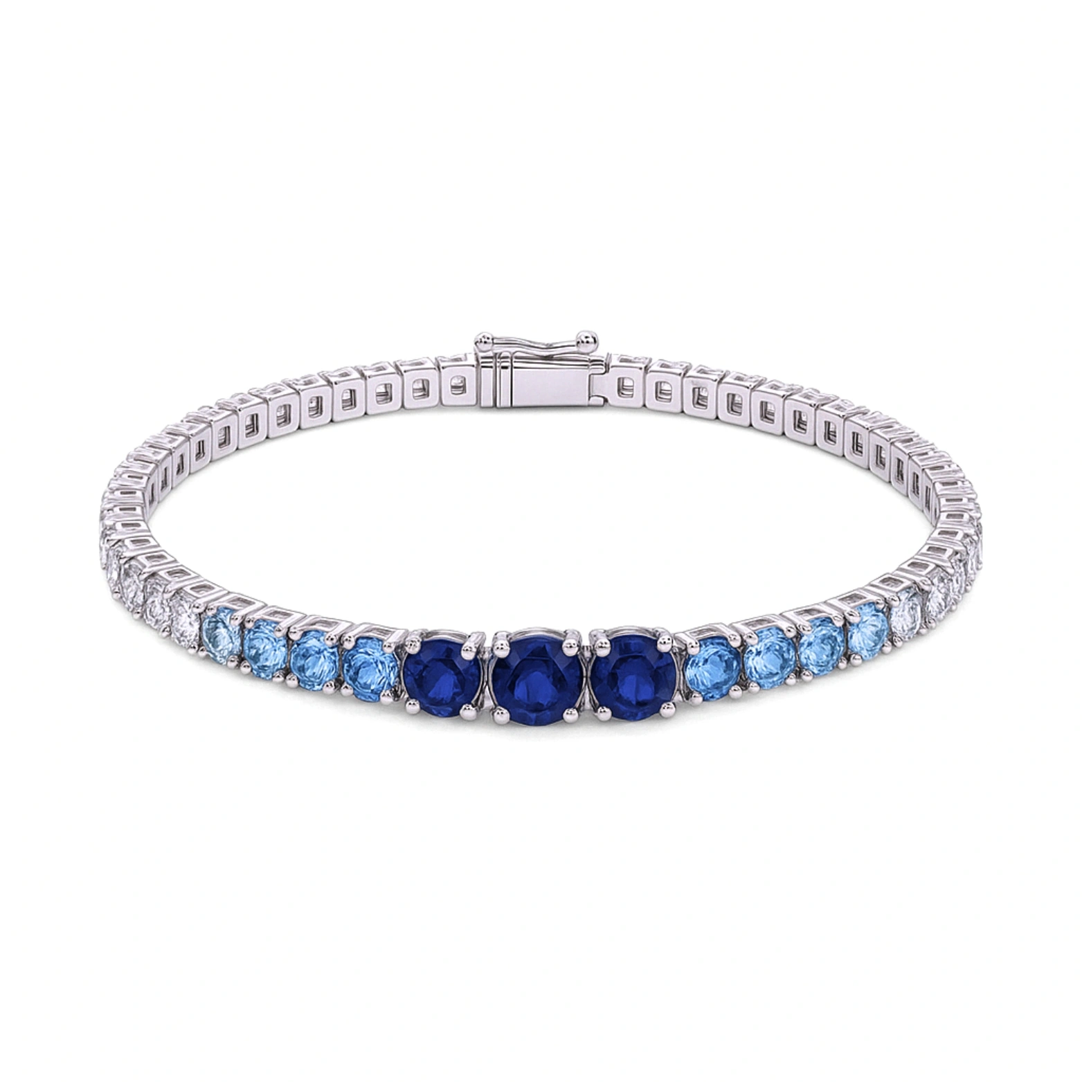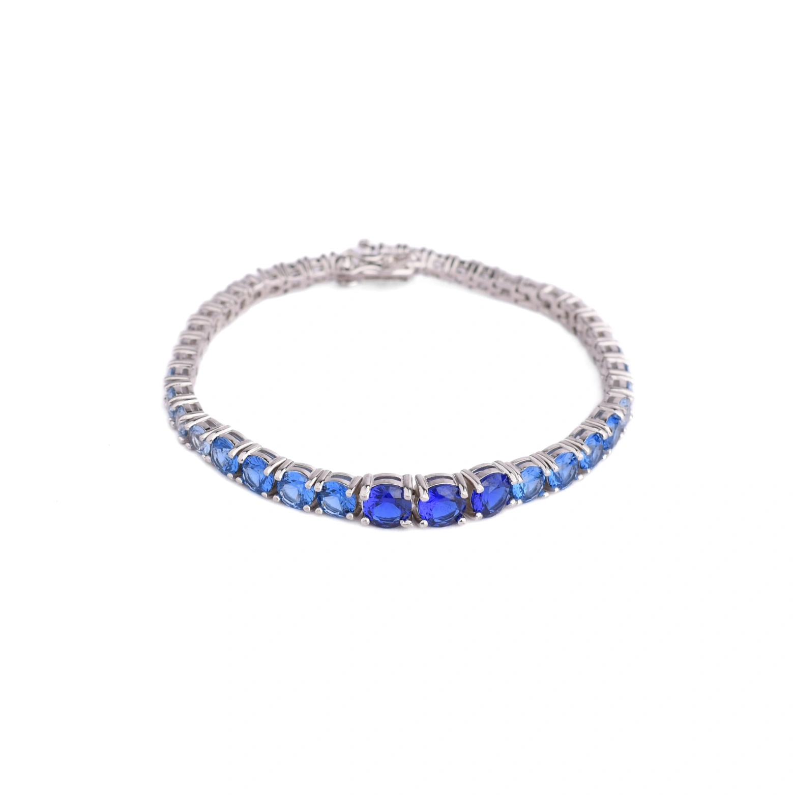 Crafted from 92.5 sterling silver, this radiant tennis bracelet features a stunning gradient of round-cut blue stones—from soft sky to deep sapphire. The secure box clasp adds both function and finesse, making this piece perfect for adding a touch of refined glamour to any outfit, day or night.