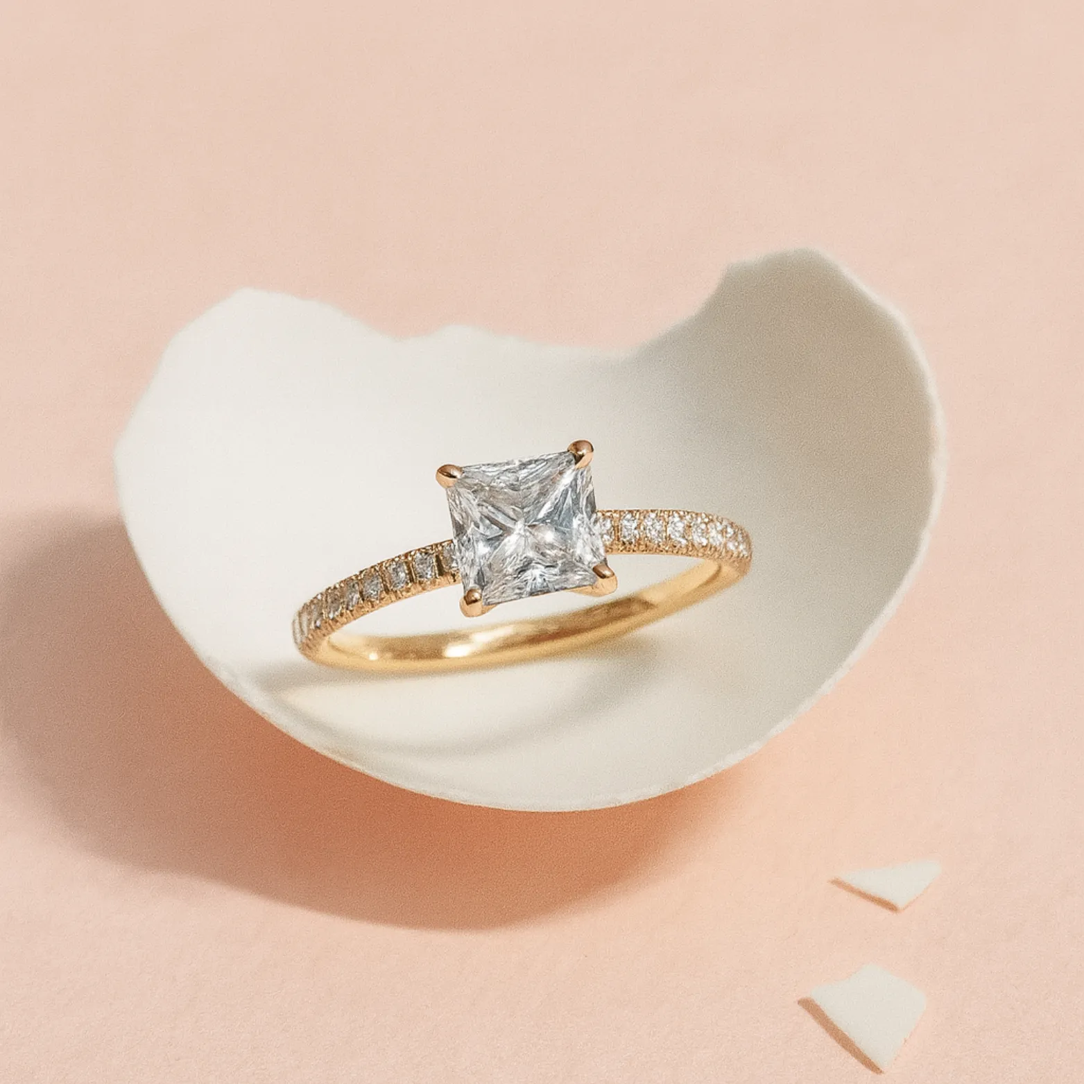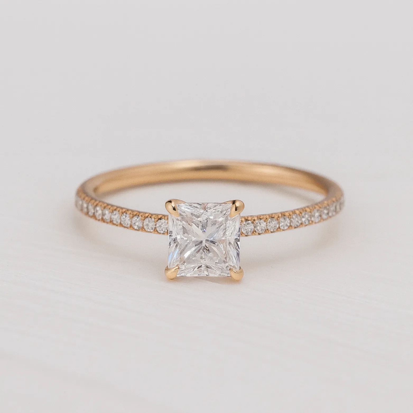 Design – Princess-cut solitaire centerpiece with a micro-studded stone band for added sparkle