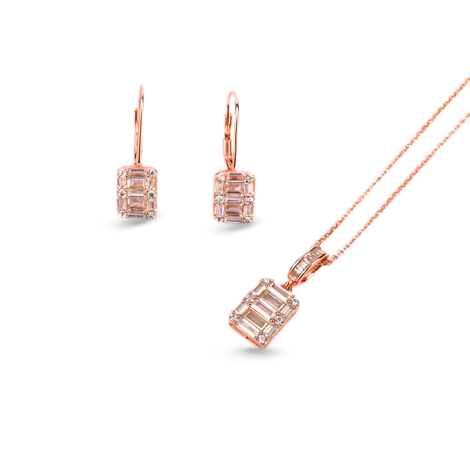 Elevate your elegance with this dazzling baguette-cut pendant and earrings set in rose gold finish.