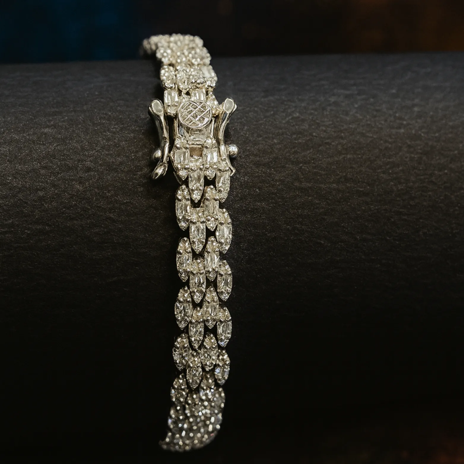 A dazzling cluster-style sterling silver bracelet with rows of shimmering cubic zirconia