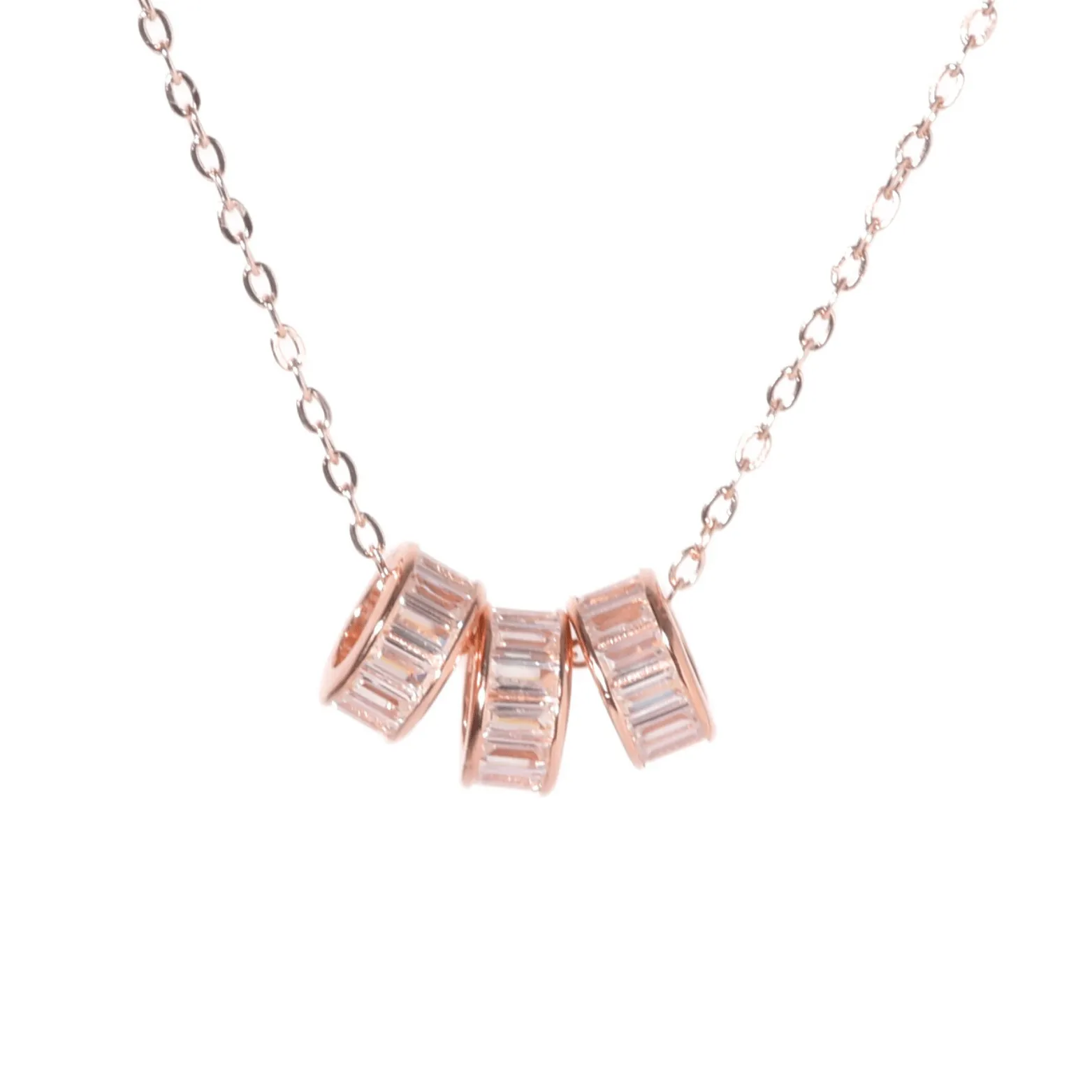 Add a touch of modern glamour to your jewelry collection with the Ekaa Rosé Baguette Trio Necklace. Crafted from 92.5 sterling silver and coated in a luxurious rose gold finish, this dainty necklace features three barrel-shaped charms adorned with precision-cut baguette cubic zirconia stones. The unique placement and shape of the charms create a soft shimmer that moves gracefully with you. Ideal for layering or wearing solo, this piece is the epitome of everyday elegance with a hint of high-fashion allure.