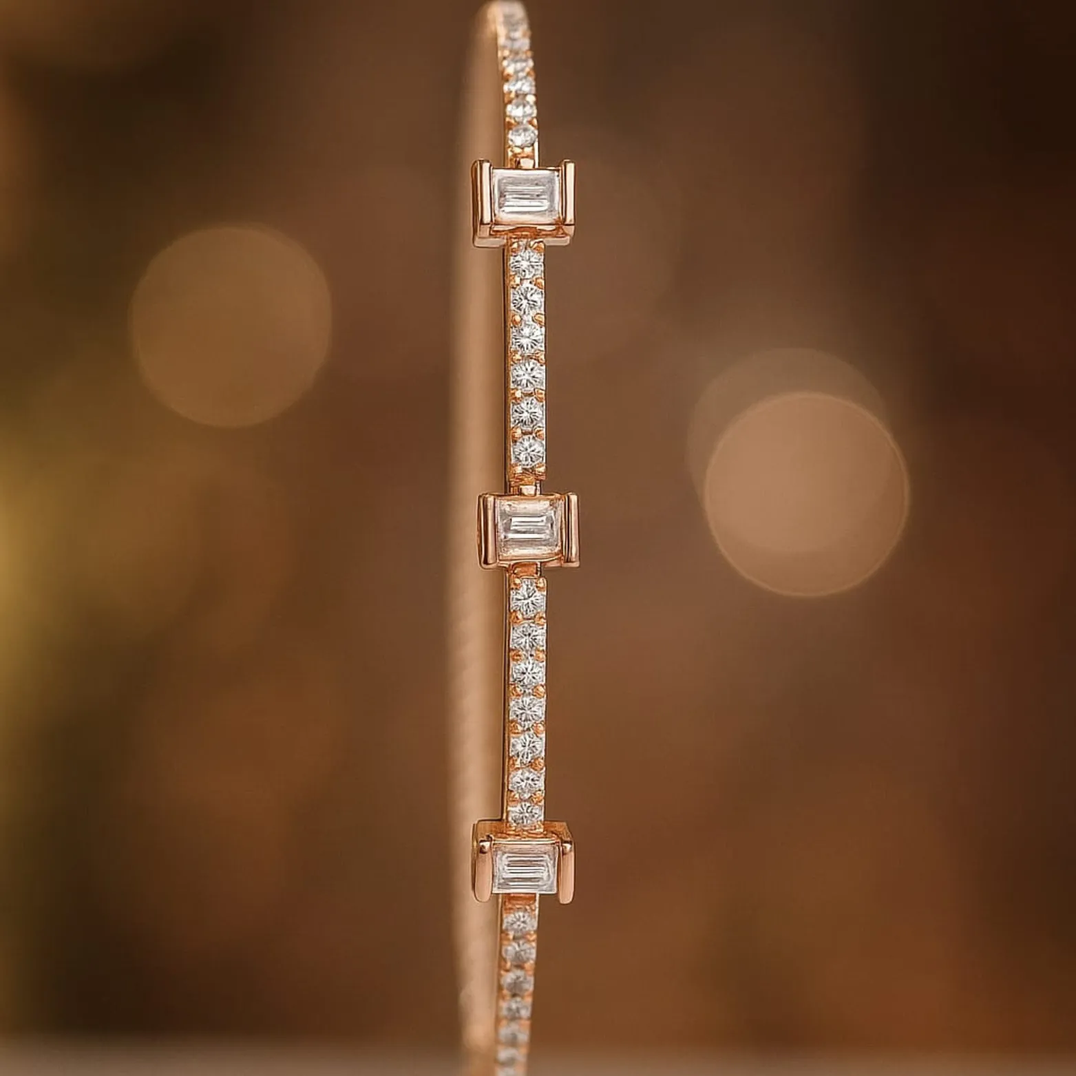 Crafted in 92.5 sterling silver with radiant rose gold plating, this bracelet blends modern minimalism with timeless sparkle. The design features a delicate line of cubic zirconia stones interrupted by sleek bar-link accents, giving it a contemporary edge. Lightweight and versatile, it’s perfect for layering or wearing solo as a refined statement piece. Designed for comfort and elegance, this bracelet transitions seamlessly from everyday wear to evening glamour.