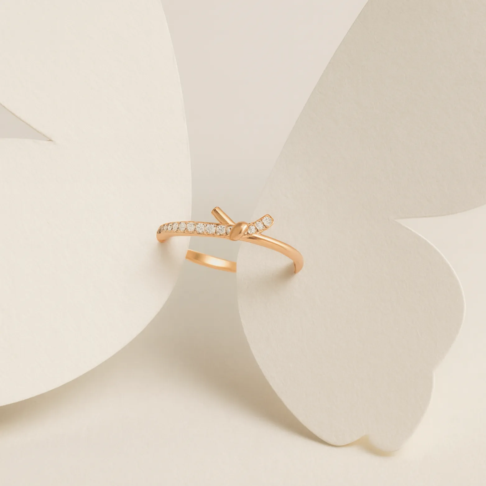 A dainty rose gold bow knot ring with CZ sparkle, symbolizing elegance and love