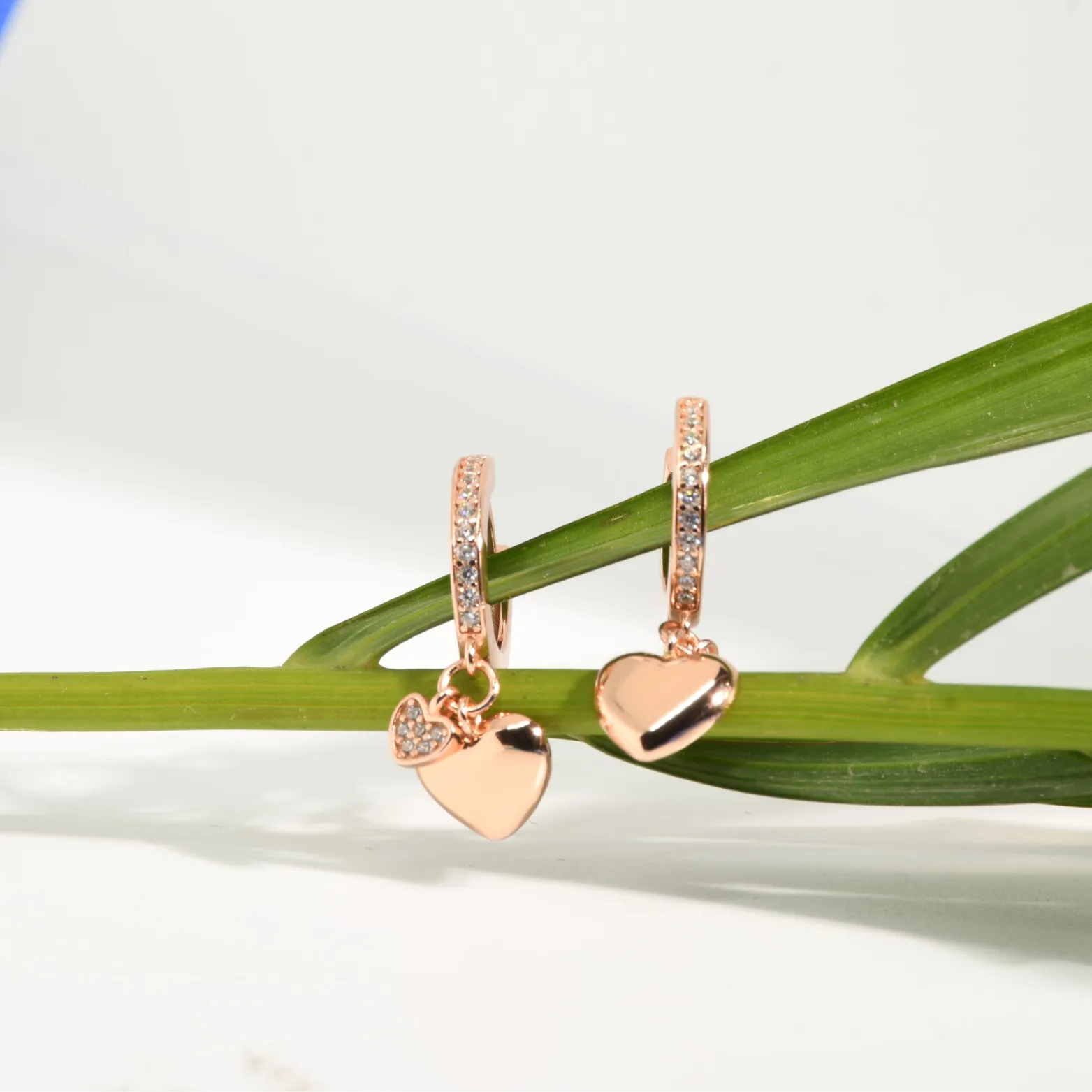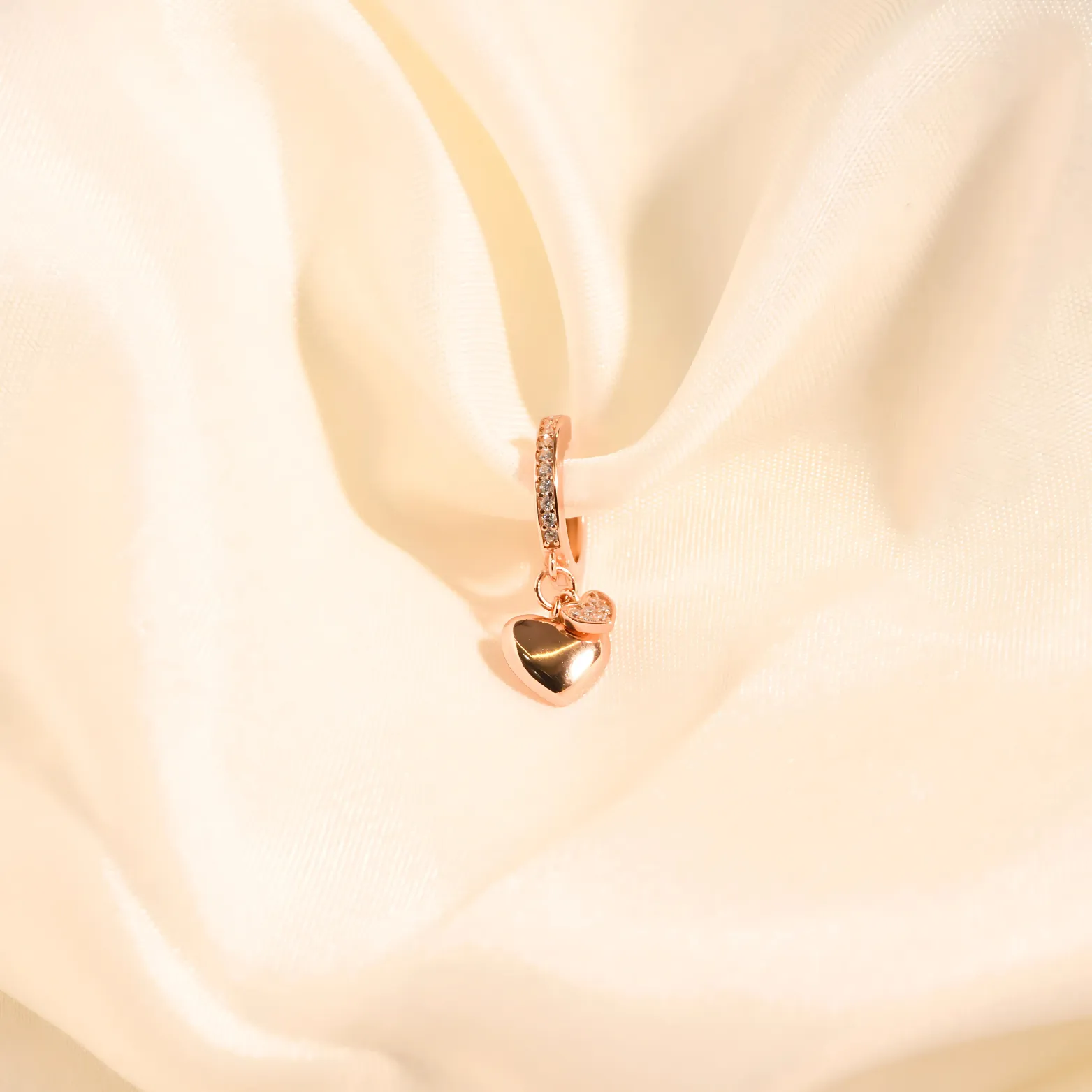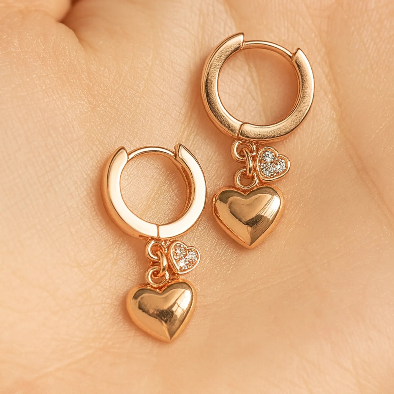 Chic rose gold hoop earrings with dangling heart charm and sparkling CZ accent.