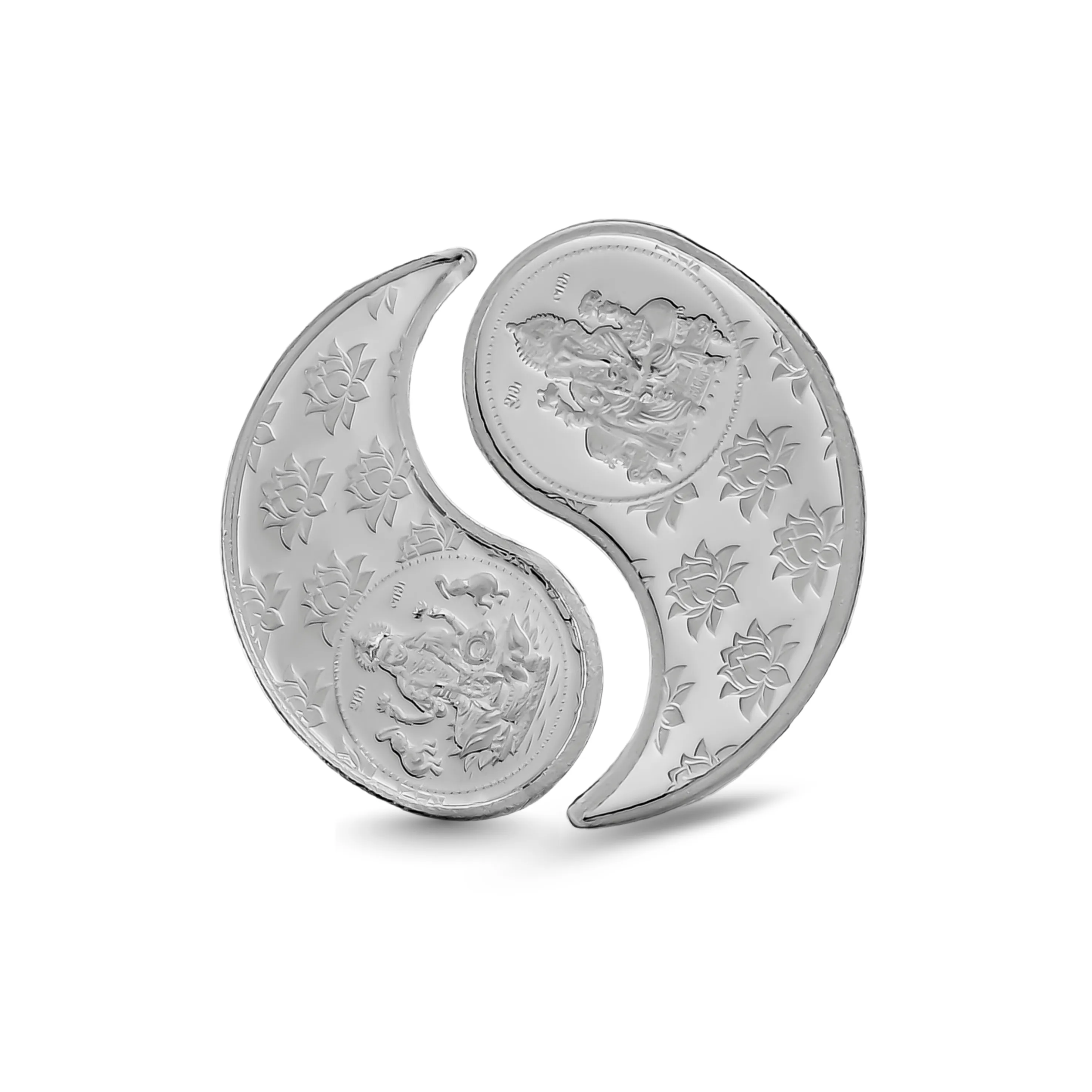 Celebrate harmony, spirituality, and abundance with the Ekaa Jewels Shri Lakshmi Ganesh Silver Coin, masterfully designed in a unique Yin-Yang shape and crafted from 99.9% pure fine silver.