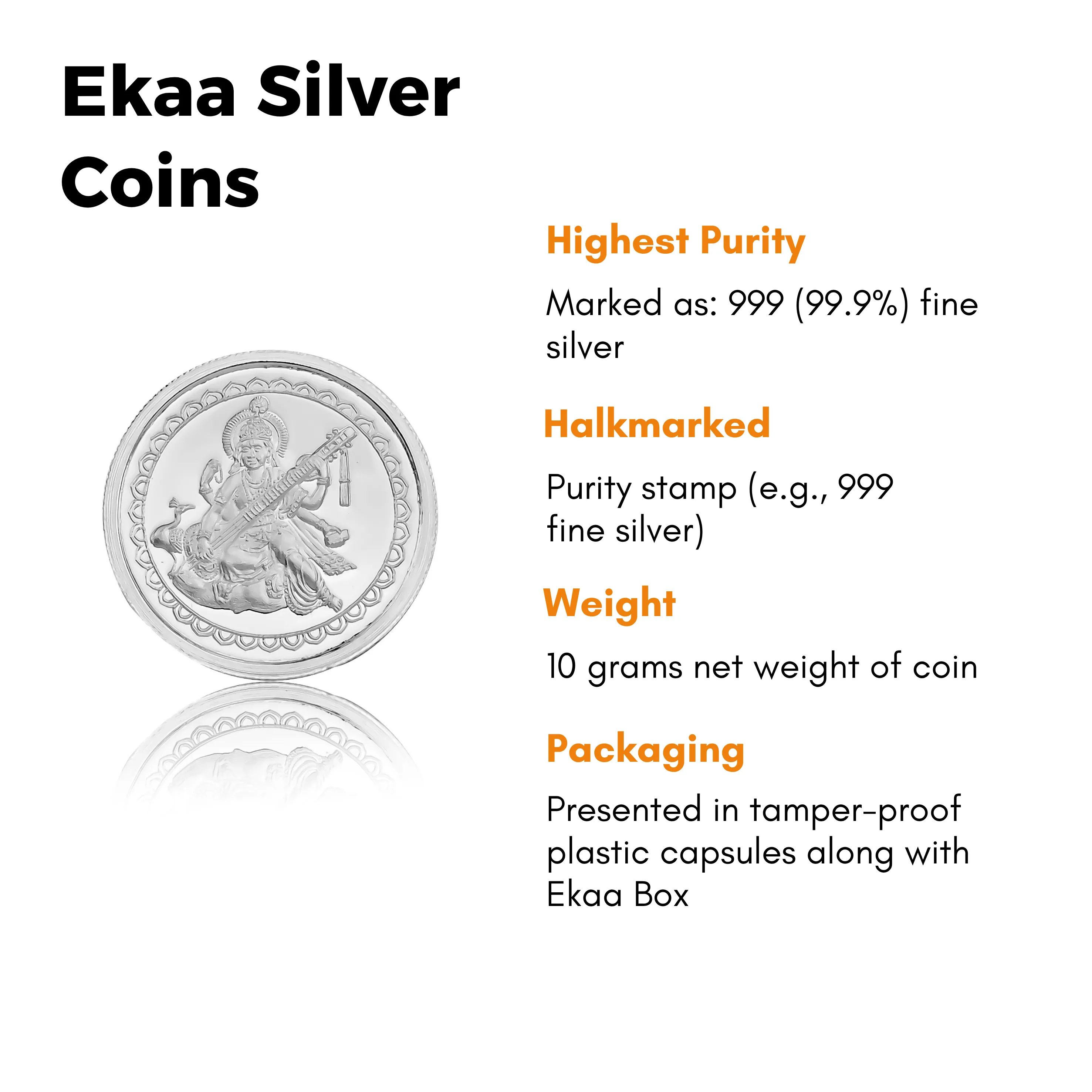 Seek the blessings of wisdom and knowledge with the Shri Saraswati Ji 999 Fine Silver Coin — a divine symbol of purity and enlightenment by Ekaa Jewels.