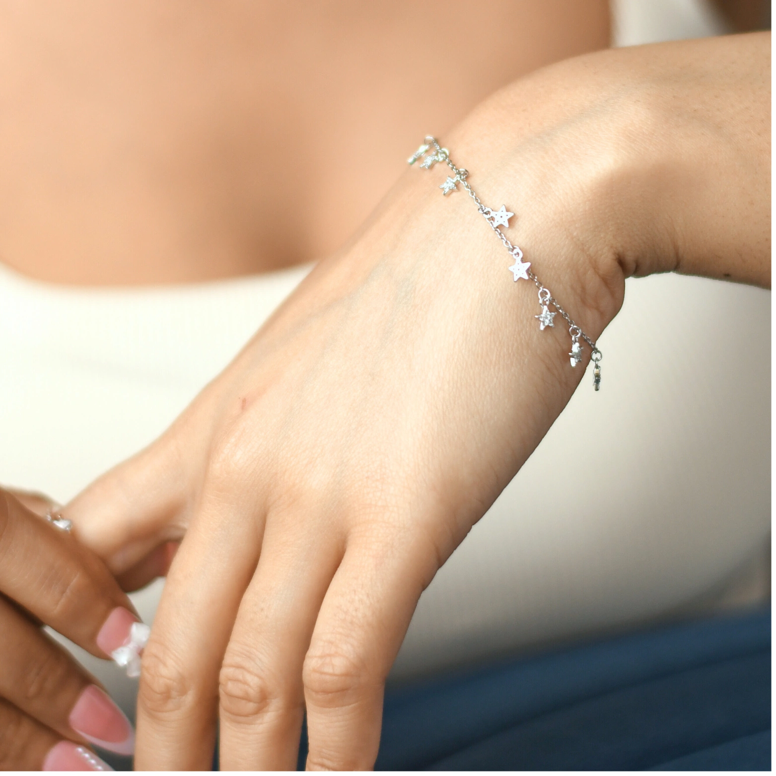 Crafted from 92.5 sterling silver, the Stellar Spark Bracelet features a constellation of twinkling star-shaped charms, each encrusted with fine cubic zirconia. The adjustable link chain ensures a perfect fit, while the lightweight design makes it ideal for both layering and solo wear. A timeless piece that adds a celestial shimmer to any look.
