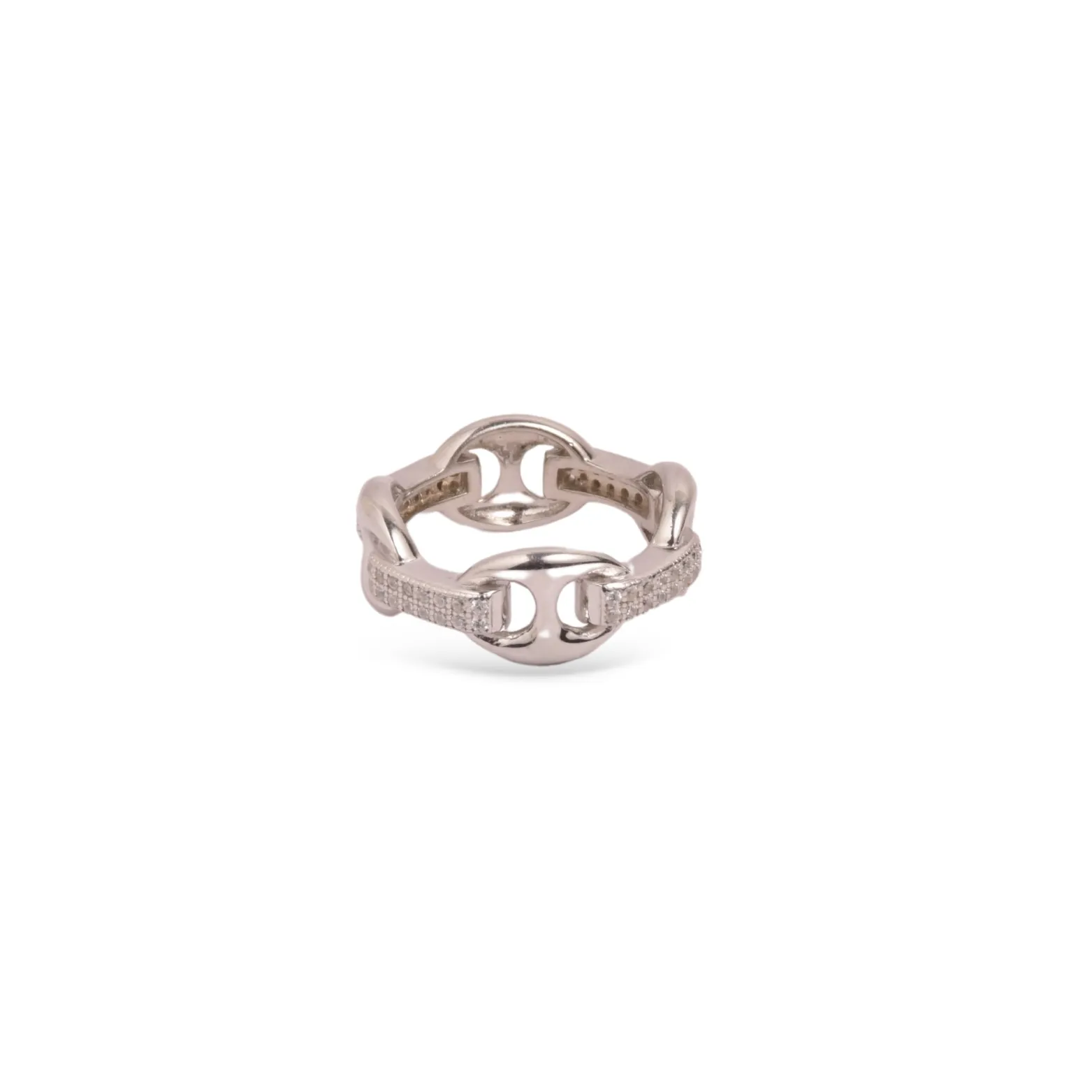 Make a statement with this bold chain-link ring, crafted in 92.5 sterling silver and accented with rows of pavé-set cubic zirconia. Its interlocking design symbolizes strength and connection, while the glossy finish and embedded sparkle give it a high-fashion edge. Wear it solo for standout glam or stack it with minimalist bands for contrast.