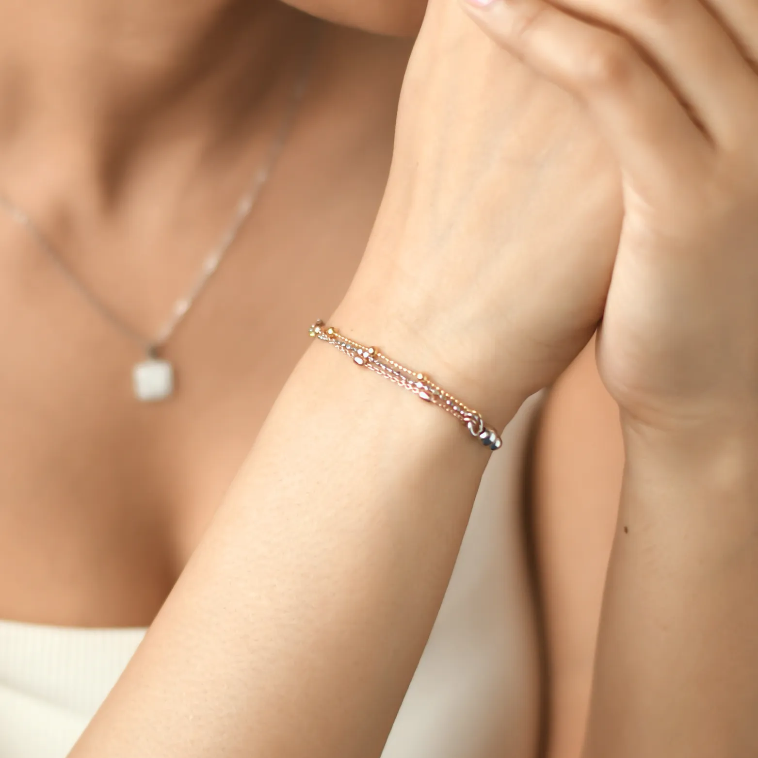 Design – Triple chain bracelet with metallic bead accents in three elegant tones